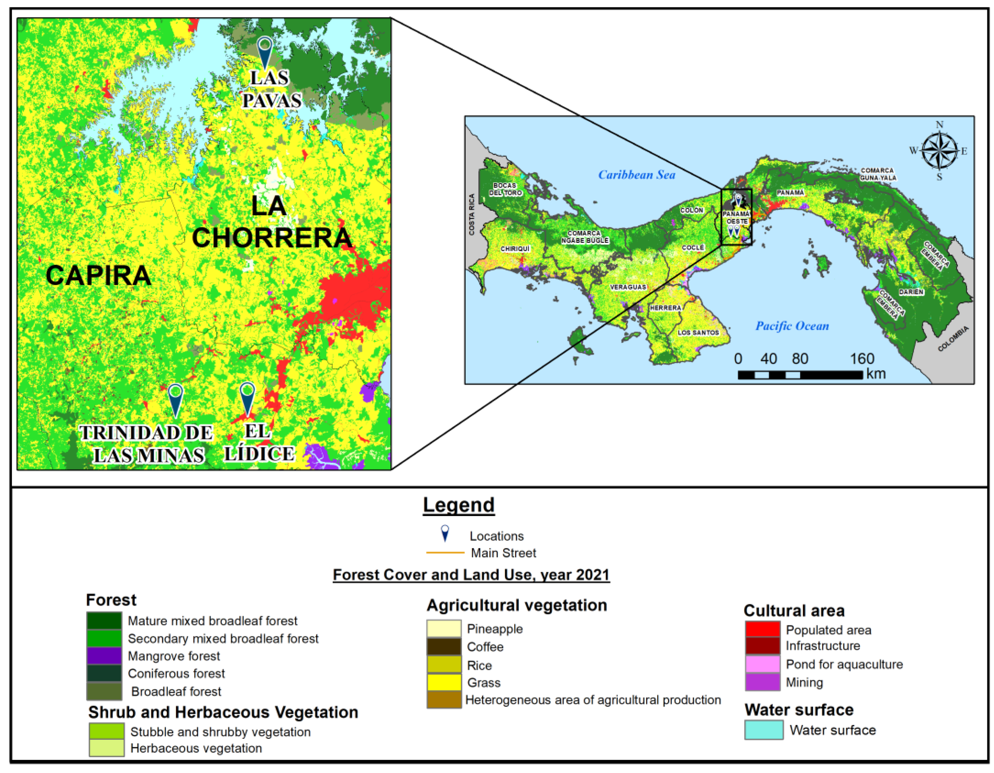 - Ministry of Environment of Panama. Panama Land Cover and Forest Distribution. 2021. Available online: https://miambiente.gob.pa/miambiente-implementa-sistema-nacional-de-informacion-ambiental-y-presenta-los-resultados-del-diagnostico-de-cobertura-boscosa/ (accessed on 11 June 2025).