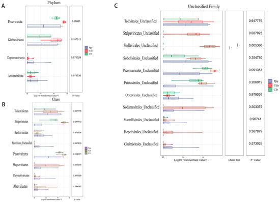 Taxonomic annotation showed that the viral communities across the three crow species were classified into 4 phyla and 8 classes. At the phylum level, Pisuviricota (83.6%) was the most abundant, followed by Kitrinoviricota (16.17%), Duplornaviricota (0.17%), and Artverviricota (0.05%). Within each group, Pisuviricota and Kitrinoviricota were the predominant phyla, especially in the Cfr and Cda groups where Pisuviricota dominated (Figure 2A). At the class level, the relative abundances were ranked as follows: Stelpaviricetes (43.35%), Pisoniviricetes (40.17%), Tolucaviricetes (9.35%), and Magsaviricetes (6.45%). The remaining four classes (Chrymotiviricetes, Alsuviricetes, Revtraviricetes, Pisuviricota_Unclassified) had abundances of less than 1%. Across the three groups, Pisoniviricetes and Stelpaviricetes were the dominant classes within the viral communities (Figure 2B). Sequences were classified at the family level as Solemoviridae and Potyviridae. Furthermore, a considerable fraction of viral sequences remained unclassified at the family level and were instead annotated as unclassified taxa within distinct orders, predominantly Picornavirales_Unclassified (34.55%), Stellavirales_Unclassified (26.24%), and Patatavirales_Unclassified (13.42%) (Figure 2C). To assess intergroup abundance differences, Kruskal–Wallis tests were conducted at the phylum and class levels, with p-values corrected using the Benjamini–Hochberg method. No significant differences were observed among the groups at the phylum (Figure 3A) or class levels (Figure 3B). However, within the unclassified families, a significant difference was detected for Stellavirales_Unclassified (p = 0.005) (Figure 3C).