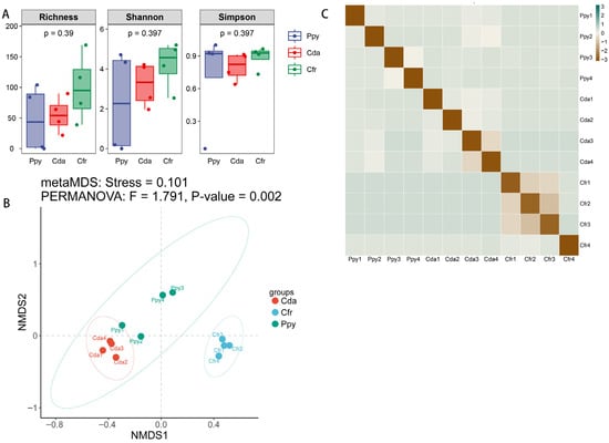 To compare the overall diversity of viral communities across the three crow groups, we computed diversity indices at the vOTU level. The Richness index quantifies the number of distinct viral sequences per sample, indicating community richness; the Shannon index reflects both diversity and evenness; and the Simpson index measures the dominance and uniformity of abundant sequences, collectively characterizing viral community diversity. The Cfr group exhibited higher α-diversity (Richness: 99.5 ± 56.014, Shannon: 4.221 ± 1.203, Simpson: 0.887 ± 0.105) compared to the Cda (55 ± 28.959, 3.212 ± 1.123, 0.8 ± 0.129) and Ppy groups (47.75 ± 54.039, 2.31 ± 2.563, 0.723 ± 0.451), indicating greater viral richness, evenness, and overall diversity. The Ppy group not only showed the lowest diversity but also the highest variability, suggesting a less stable community structure. Intergroup comparison tests revealed no statistically significant differences among the three groups for any of the three α-diversity indices (p > 0.05) (Figure 4A). Non-metric multidimensional scaling (NMDS) analysis based on Bray–Curtis dissimilarity revealed significant differences among the three groups (p = 0.002). The samples showed clear spatial separation, indicating distinct viral community structures. The Cfr group was most distinct from the other two, while the Ppy and Cda groups partially overlapped but were still separable (Figure 4B,C).