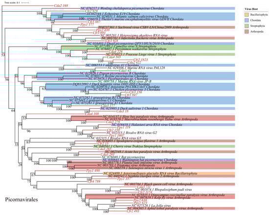 Phylogenetic analysis. Maximum-likelihood phylogenetic tree of Picornavirales. Viral operational taxonomic units (vOTUs) identified in this study are highlighted in red. Colored blocks indicate the known host taxa of reference sequences only (e.g., Arthropoda, Chordata, Streptophyta), as documented in public databases. Bootstrap support values (based on 1000 replicates) are shown at major nodes.
