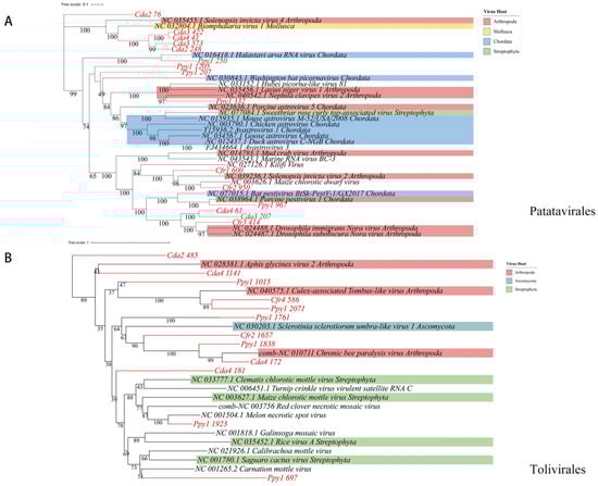 Phylogenetic analysis. Maximum-likelihood phylogenetic trees of (A) Patatavirales and (B) Tolivirales.