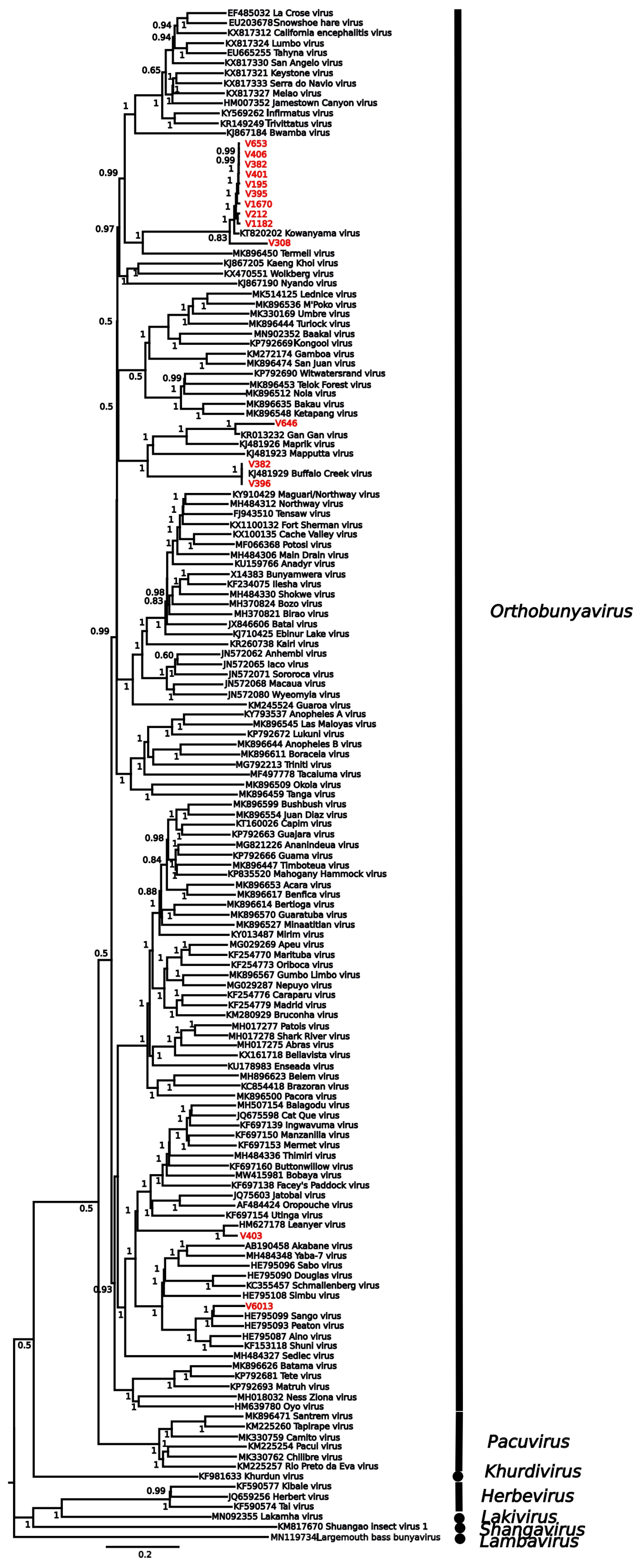 | V396 | Darwin | 4 May 1983 | A. annulipes | Bunyavirus-like virus | Buffalo Creek Orthobunyavirus | AJD77610 | >99 | 100 |