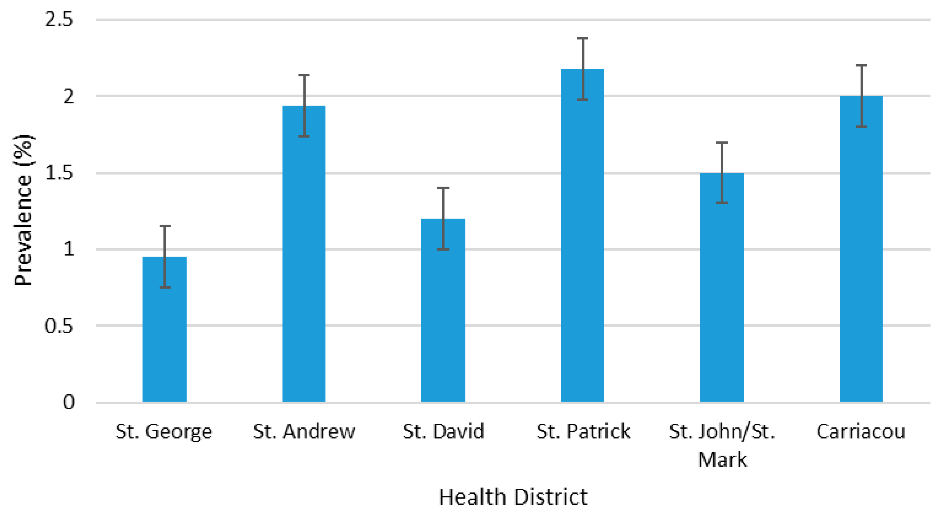 Grenada is a tri-island nation located to the south of the Caribbean archipelago. It has a population of 124,610 citizens in 2021 [20]. Grenada is divided into seven parishes as shown in Figure 1. The parishes are grouped into six health districts for the administration of health services; the two smaller parishes of St. Mark and St. John are combined into one health district—St. Mark/St. John—and the two smaller islands of Carriacou and Petite Martinique are referred to as the Carriacou health district.