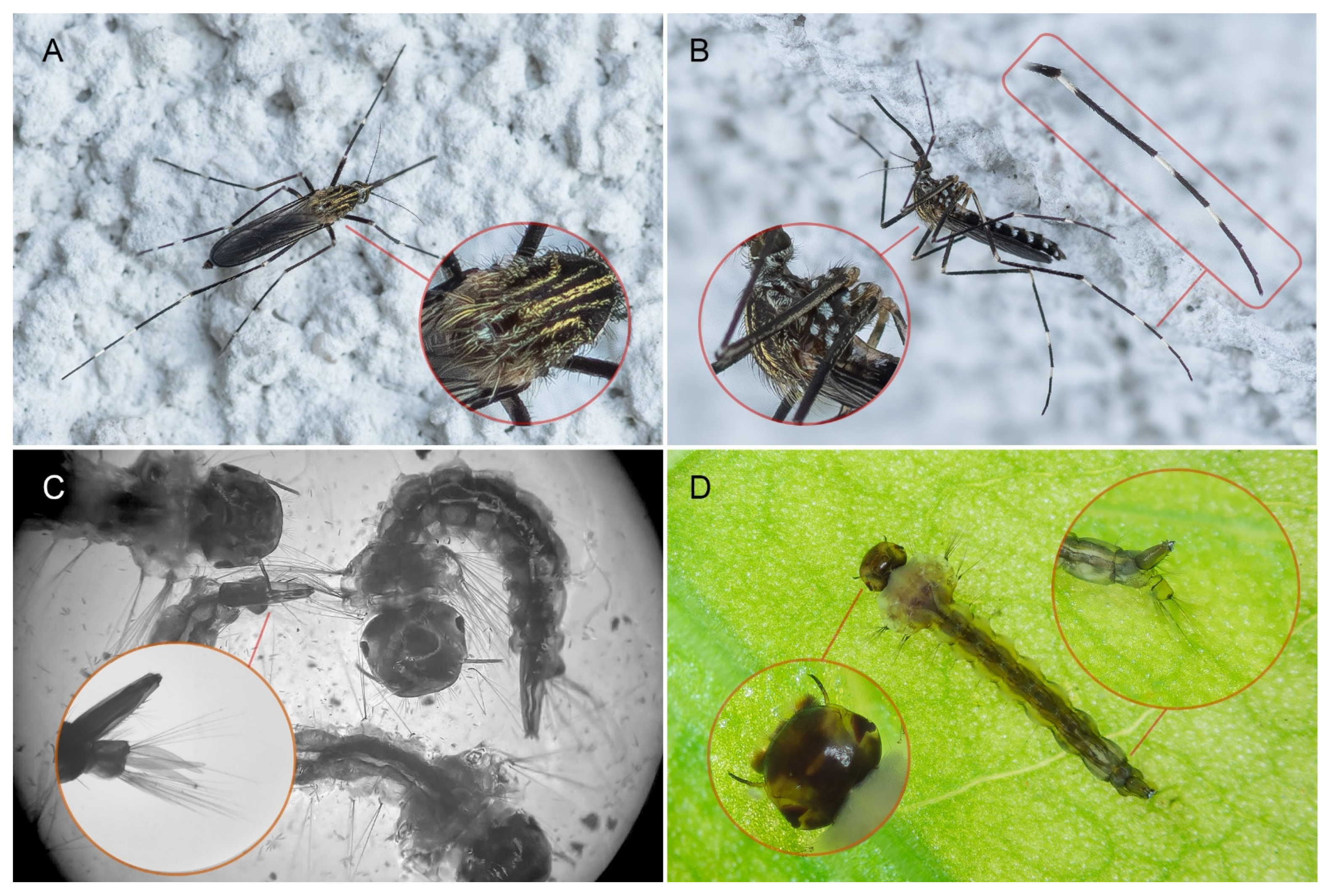 Figure 1. Characteristic features of Aedes japonicus. Adult female, top (A) and side (B) views (P.N.). (C) Larvae in microscopic photos (G.J.), and (D) from the field (P.K.).