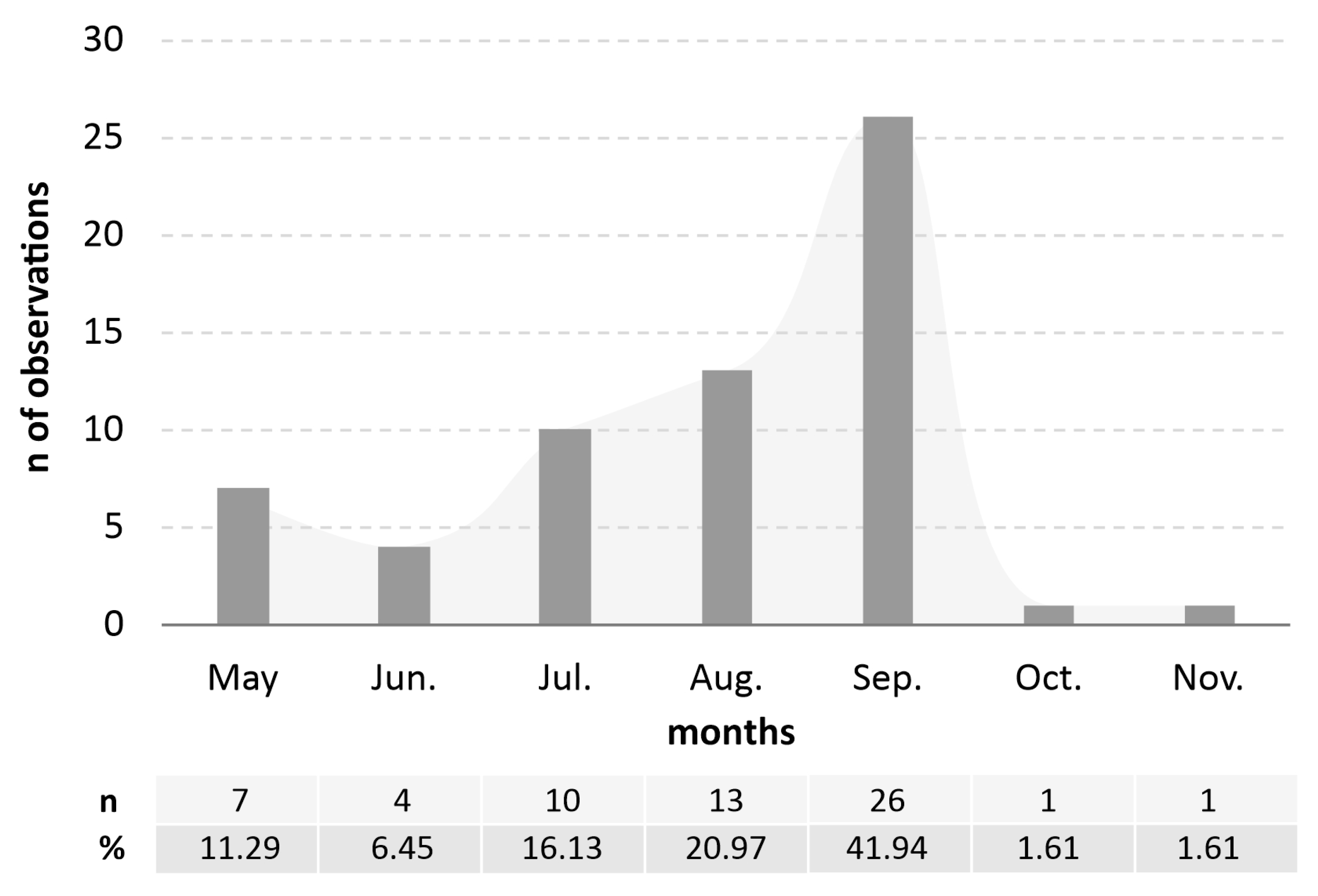 Figure 2. Seasonal activity of adult Aedes japonicus in Poland (unpublished observations of adults from 2023–2025).