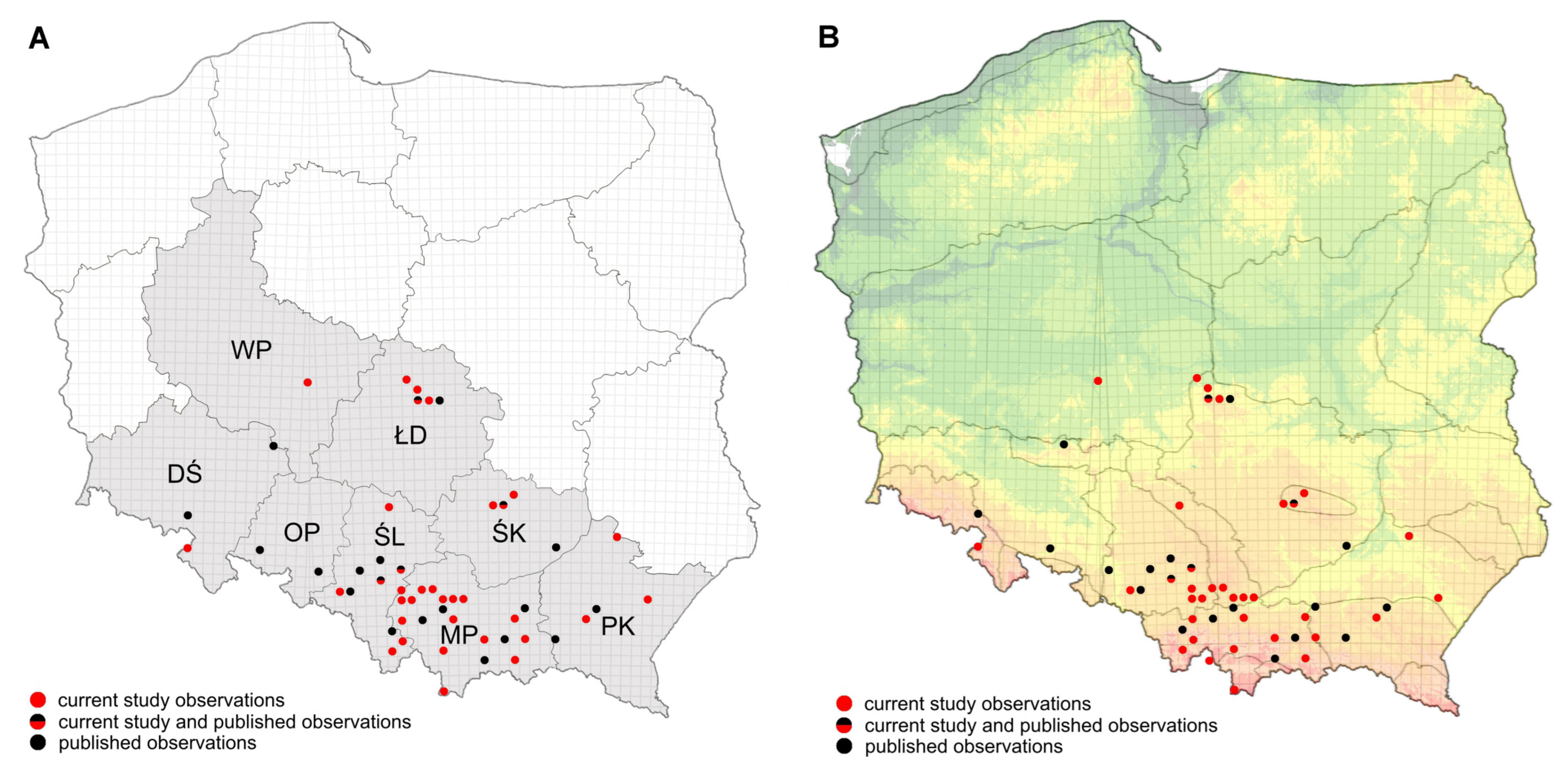 Figure 3. Observations of Aedes japonicus in Poland (2022–2025), according to voivodeship (A); and on physical map of Poland (B). Legend: DŚ—Dolnośląskie voivodeship, ŁD—Łódzkie voivodeship, MP—Małopolskie voivodeship, OP—Opolskie voivodeship, PK—Podkarpackie voivodeship, ŚK—Świętokrzyskie voivodeship, ŚL—Śląskie voivodeship, WP—Wielkopolskie voivodeship.