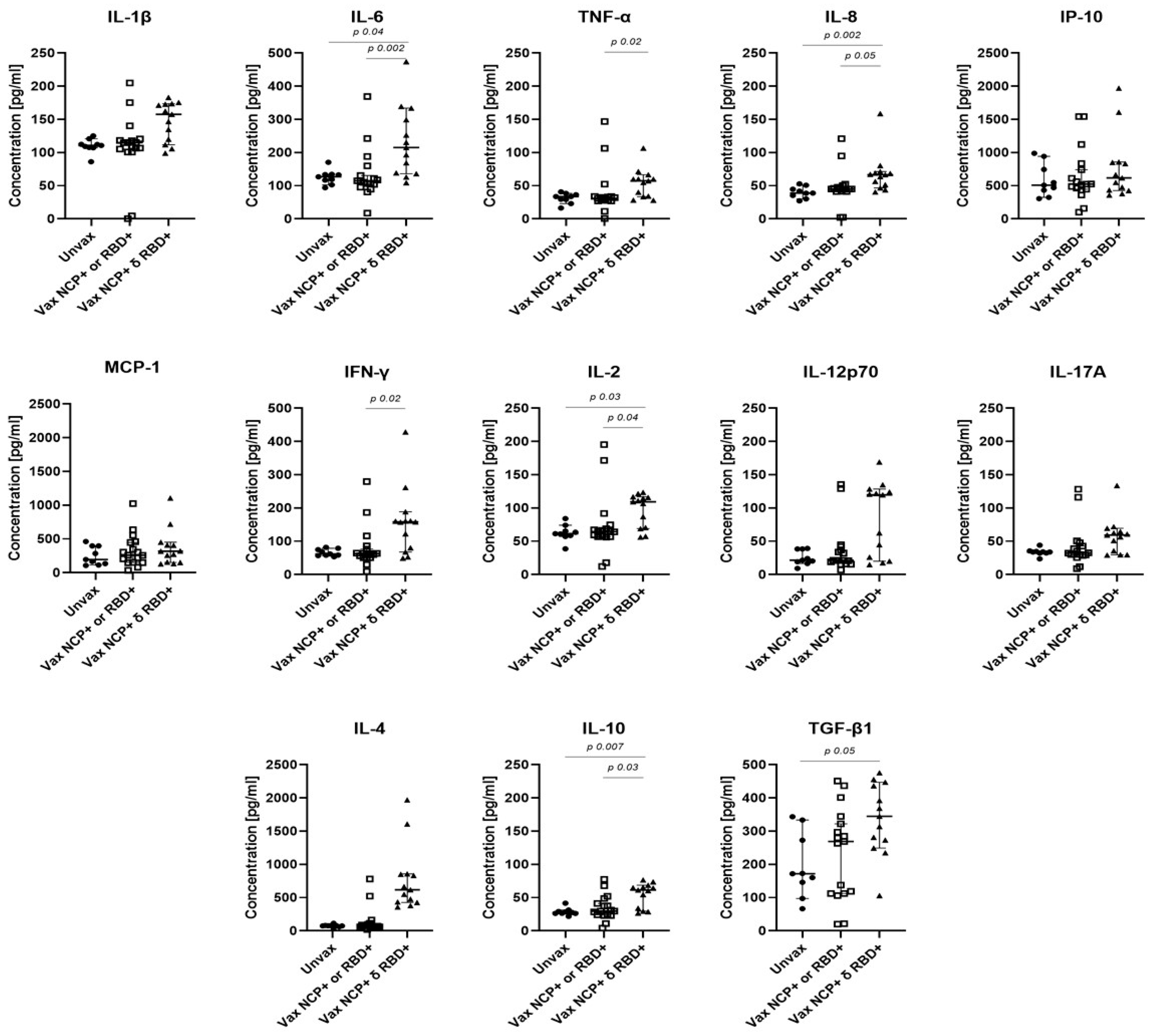 - Rosati, M.; Terpos, E.; Homan, P.; Bergamaschi, C.; Karaliota, S.; Ntanasis-Stathopoulos, I.; Devasundaram, S.; Bear, J.; Burns, R.; Bagratuni, T.; et al. Rapid Transient and Longer-Lasting Innate Cytokine Changes Associated with Adaptive Immunity after Repeated SARS-CoV-2 BNT162b2 mRNA Vaccinations. Front. Immunol. 2023, 14, 1292568. [Google Scholar] [CrossRef]