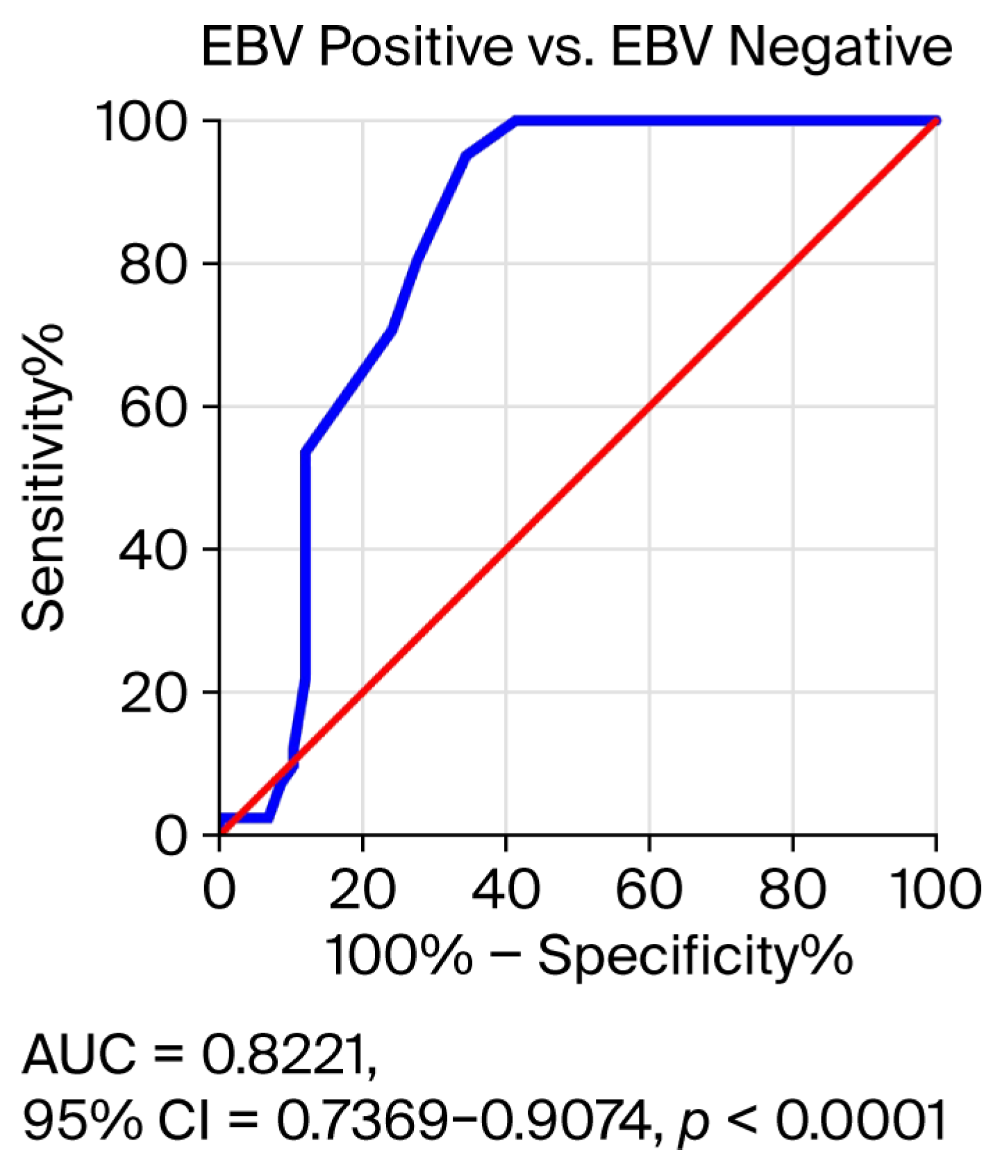3.4. Receiver Operating Characteristic (ROC) Curve Analysis to Determine the Diagnostic Accuracy of Salivary EBV DNA Load in EBV-Positive OPSCC Patients Compared to EBV-Negative Subjects