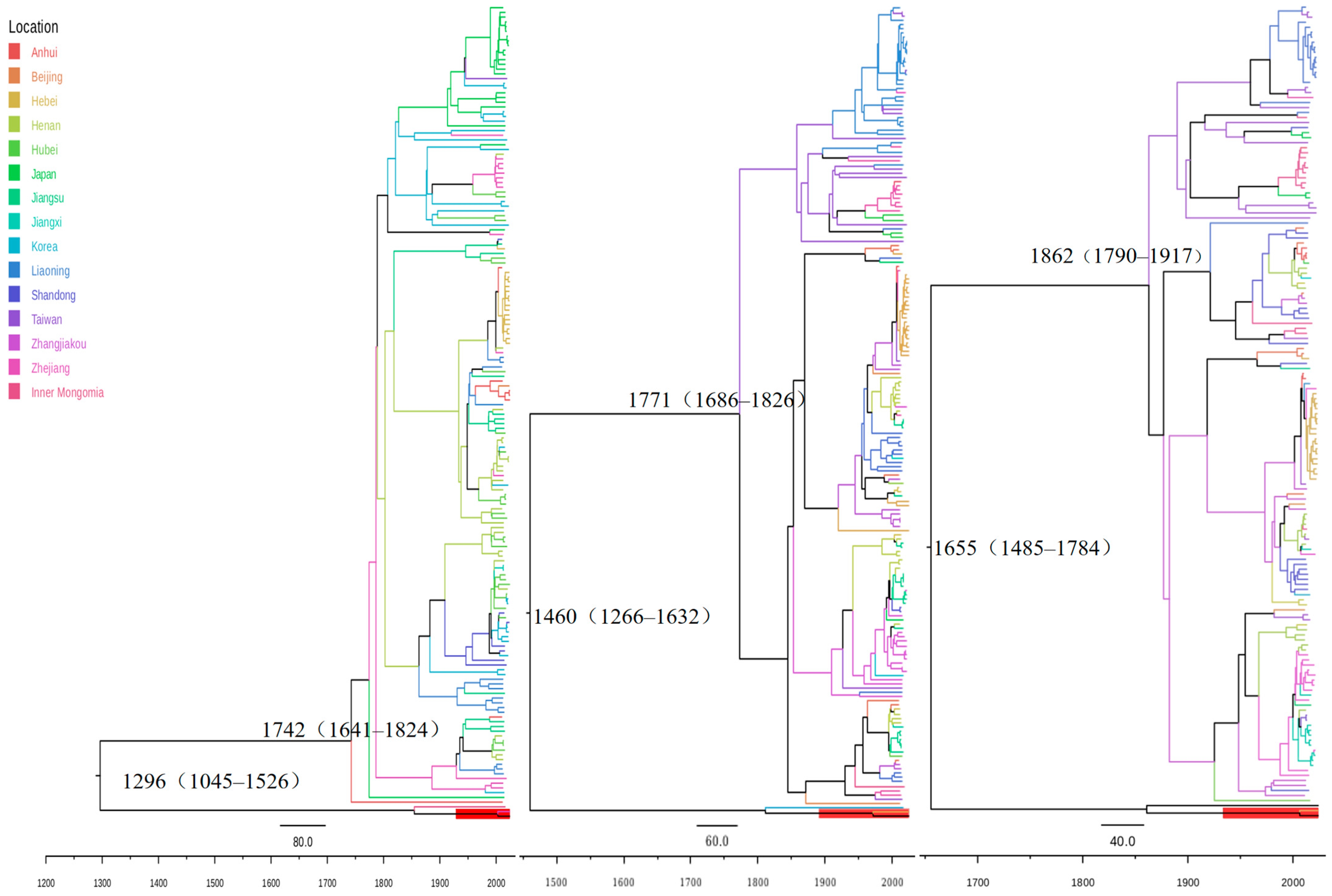 Figure 5. Time-scaled MCC trees of the L, M, and S segments of SFTSV. Branch colors indicate sampling locations. The red cluster at the bottom highlights the newly detected Hebei strains (SFTSZJK1/Hebei/2024, SFTSZJK2/Hebei/2024), which form a distinct clade. the time of most recent common ancestor (tMRCA) and 95%HPD time for each genotype and the posterior probability of major branches in the evolutionary tree were marked. The names of different colored strains in the evolutionary tree represent strains from different geographic locations.