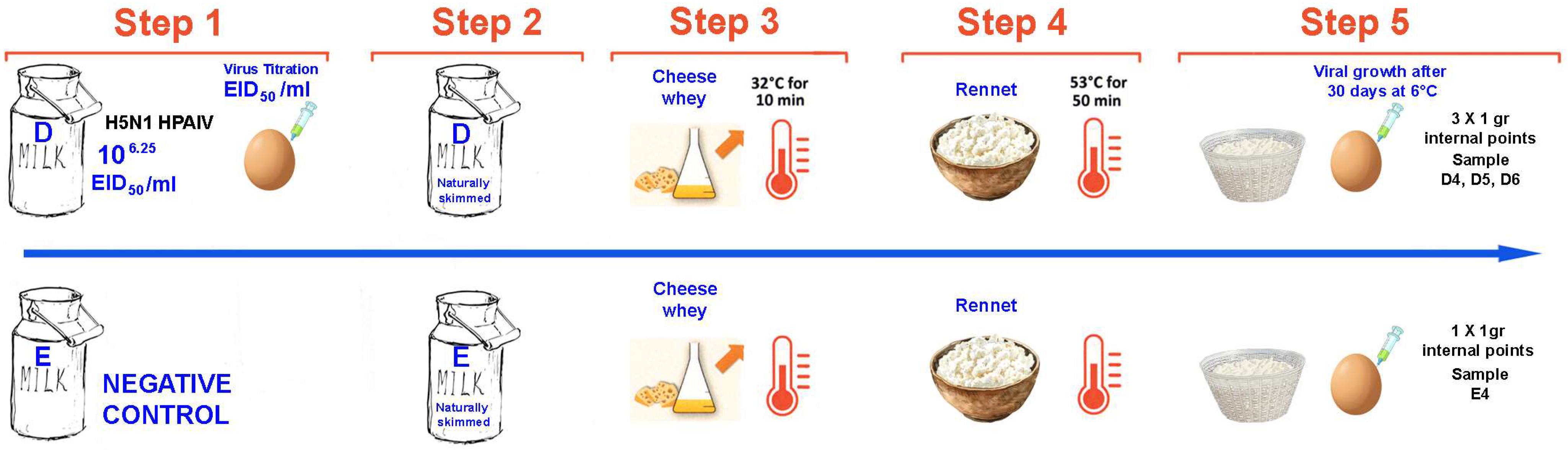 Figure 2). Two 1 L milk batches (D and E) were processed under the biosecurity conditions described in paragraph 2.1. Viral titration was performed on initial milk, and finished cheeses were tested after 30 days of ripening. Three internal 1 g samples per contaminated cheese and one internal 1 g portion were collected and tested using SPF-ECEs and confirmatory HA and MAb-NPAEL assays. The experimental setup was analogous to the H1N1 trial.