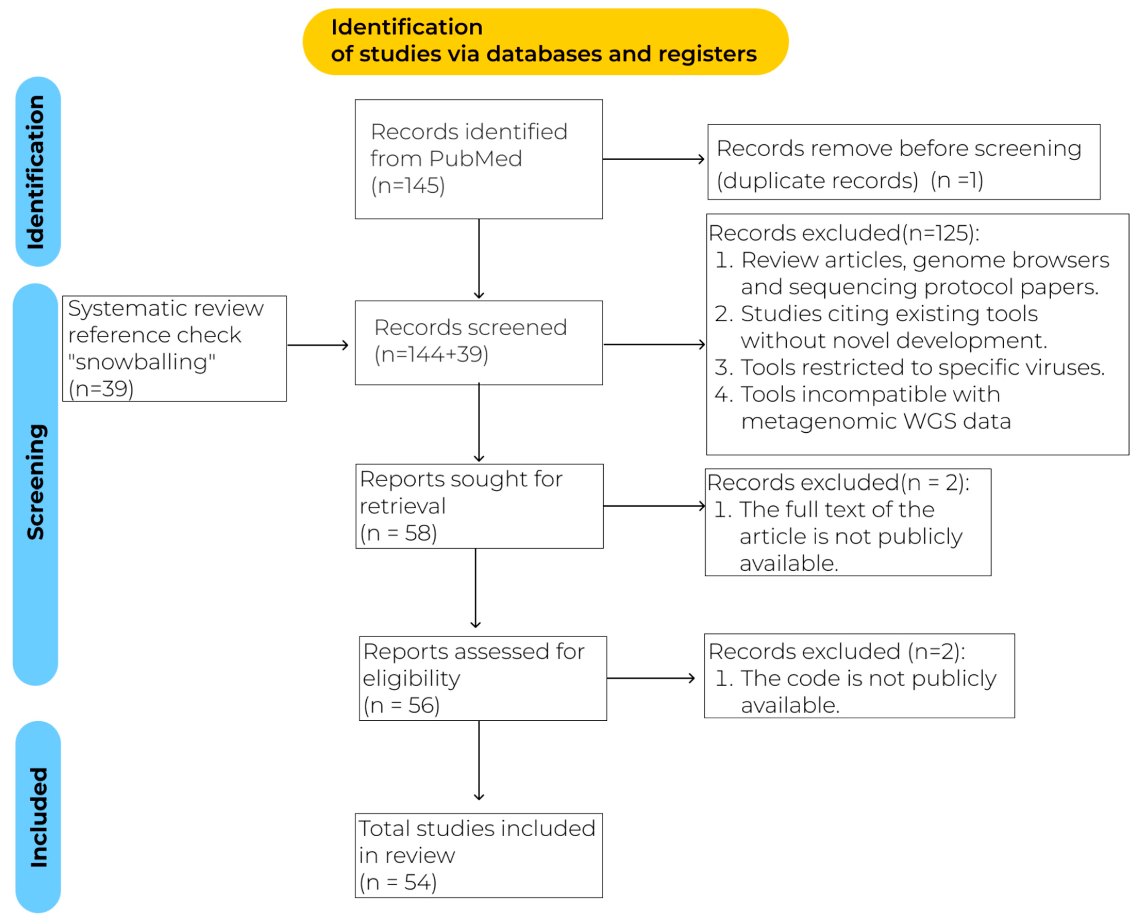 APA StyleGaleeva, J., Kuzmichenko, P., Manolov, A., Lukashev, A., & Ilina, E. (2025). Bioinformatics Tools and Approaches for Virus Discovery in Genomic Data: A Systematic Review. Viruses, 17(12), 1538. https://doi.org/10.3390/v17121538