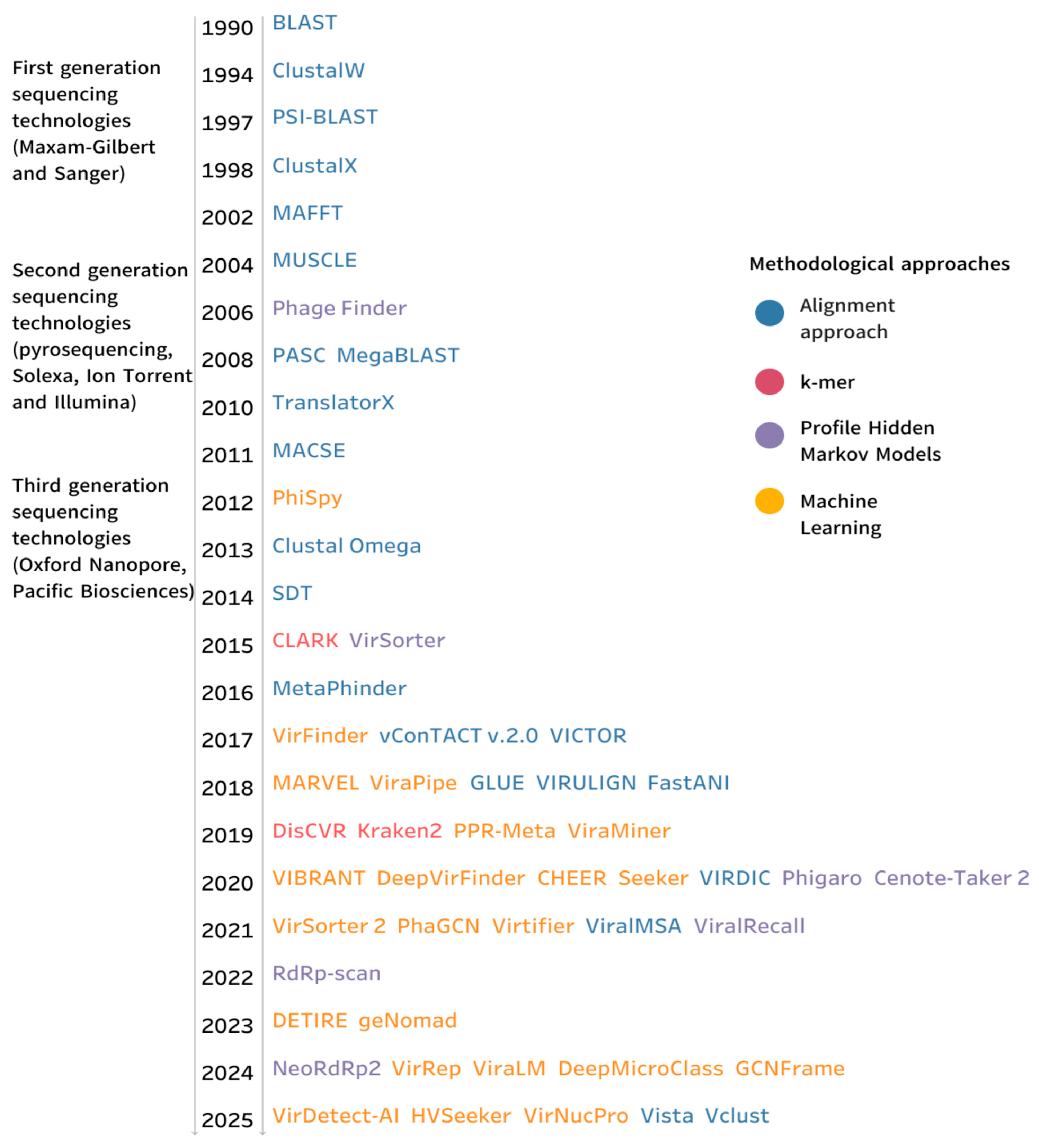 | 16 | MUSCLE | Multiple sequence alignment | - | DNA viruses, RNA viruses, bacteriophages, archaeal viruses, and eukaryotic viruses | 50,759 | - Performance drops for extremely divergent sequences (<15% identity) - Progressive alignment errors are irreversible (no global re-optimization) |
