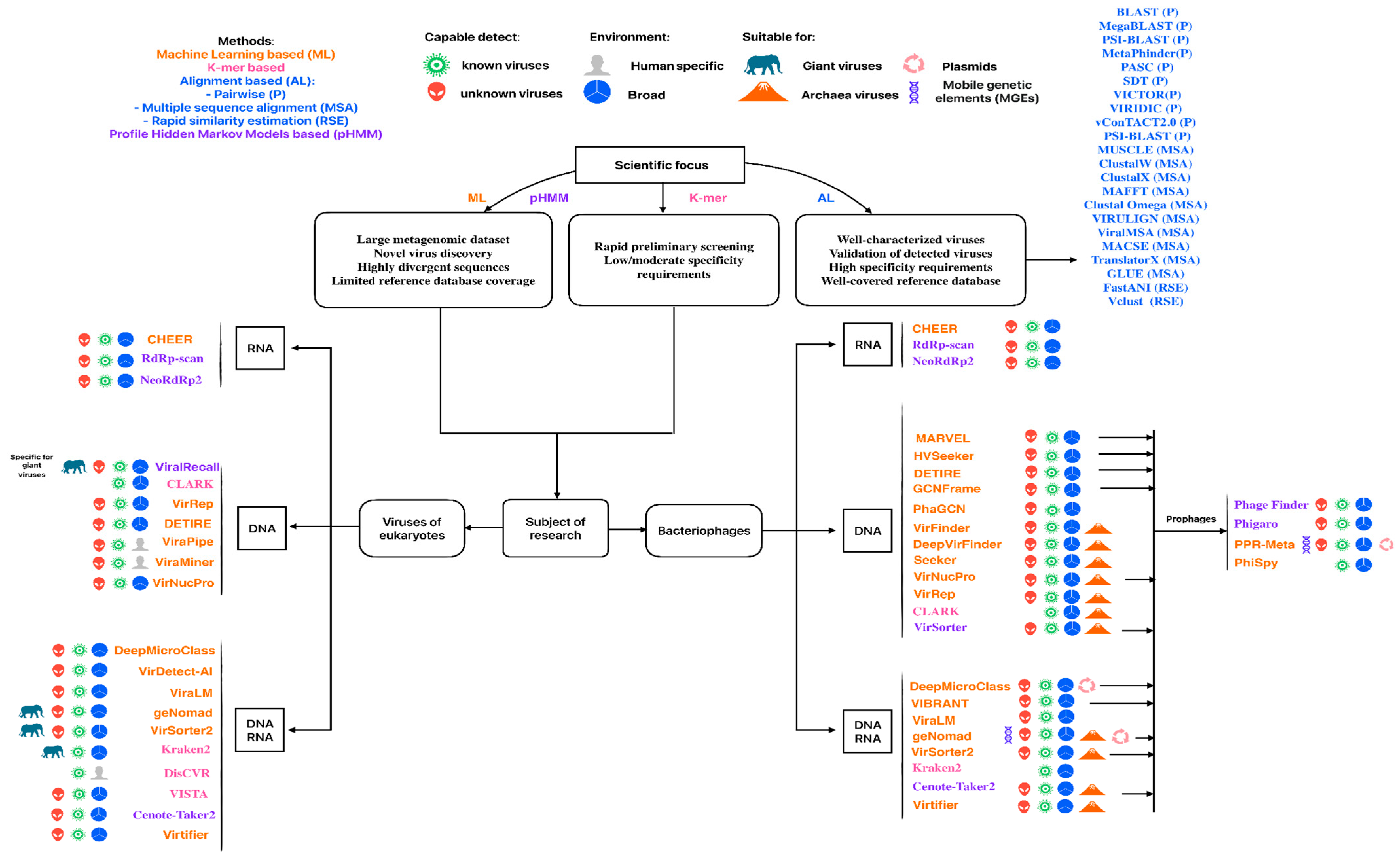 Galeeva, J.; Kuzmichenko, P.; Manolov, A.; Lukashev, A.; Ilina, E. Bioinformatics Tools and Approaches for Virus Discovery in Genomic Data: A Systematic Review. Viruses 2025, 17, 1538. https://doi.org/10.3390/v17121538