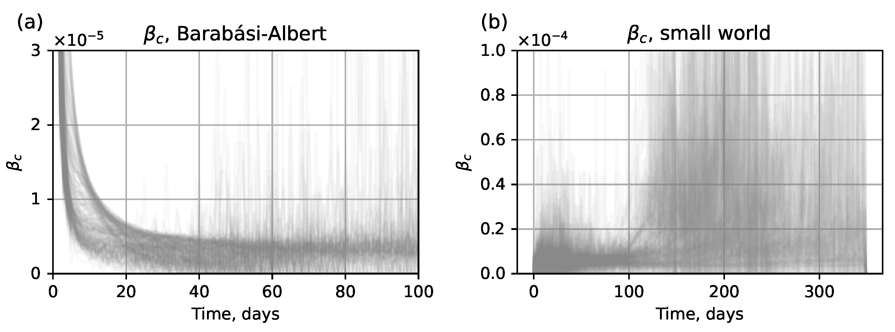- The contact network structure in the city is assumed to be stable over a multi-year period, otherwise establishing a specific topology (Barabasi–Albert or small world) would be infeasible. While this is a simplification compared to real dynamic contact patterns, it is a common assumption in data-driven demographic and epidemic modeling (see, for instance, [58]), because to construct realistic dynamical contact networks, extensive and often unavailable data is required.