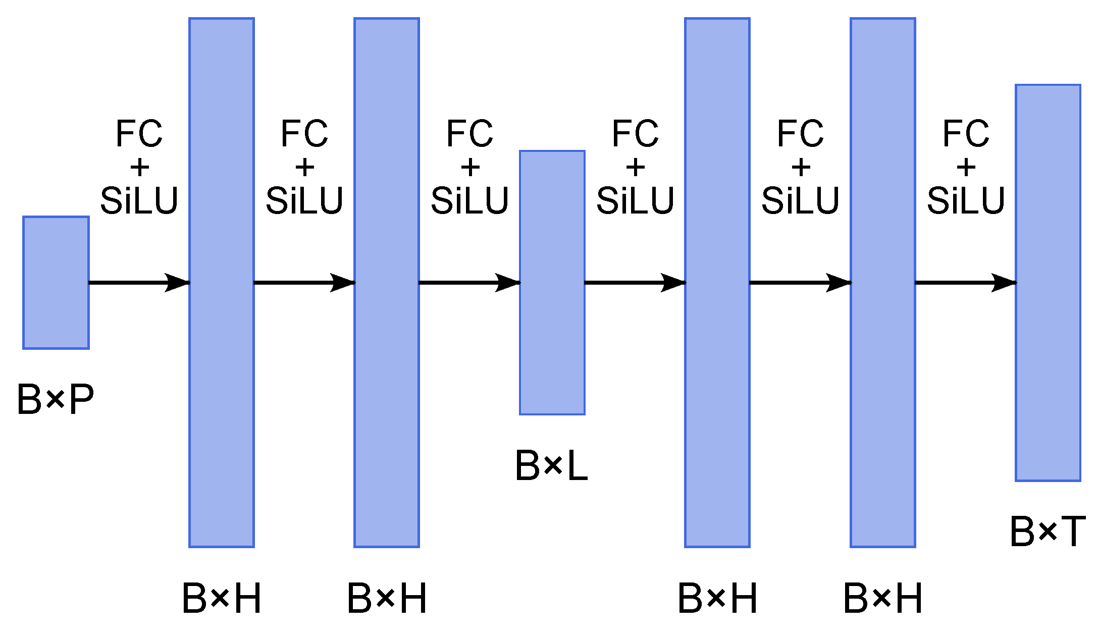 - Encoder: Three fully connected layers with SiLU activations, mapping inputs of size to latent space , where B is the batch size, P is the number of input parameters, L is the latent dimension;