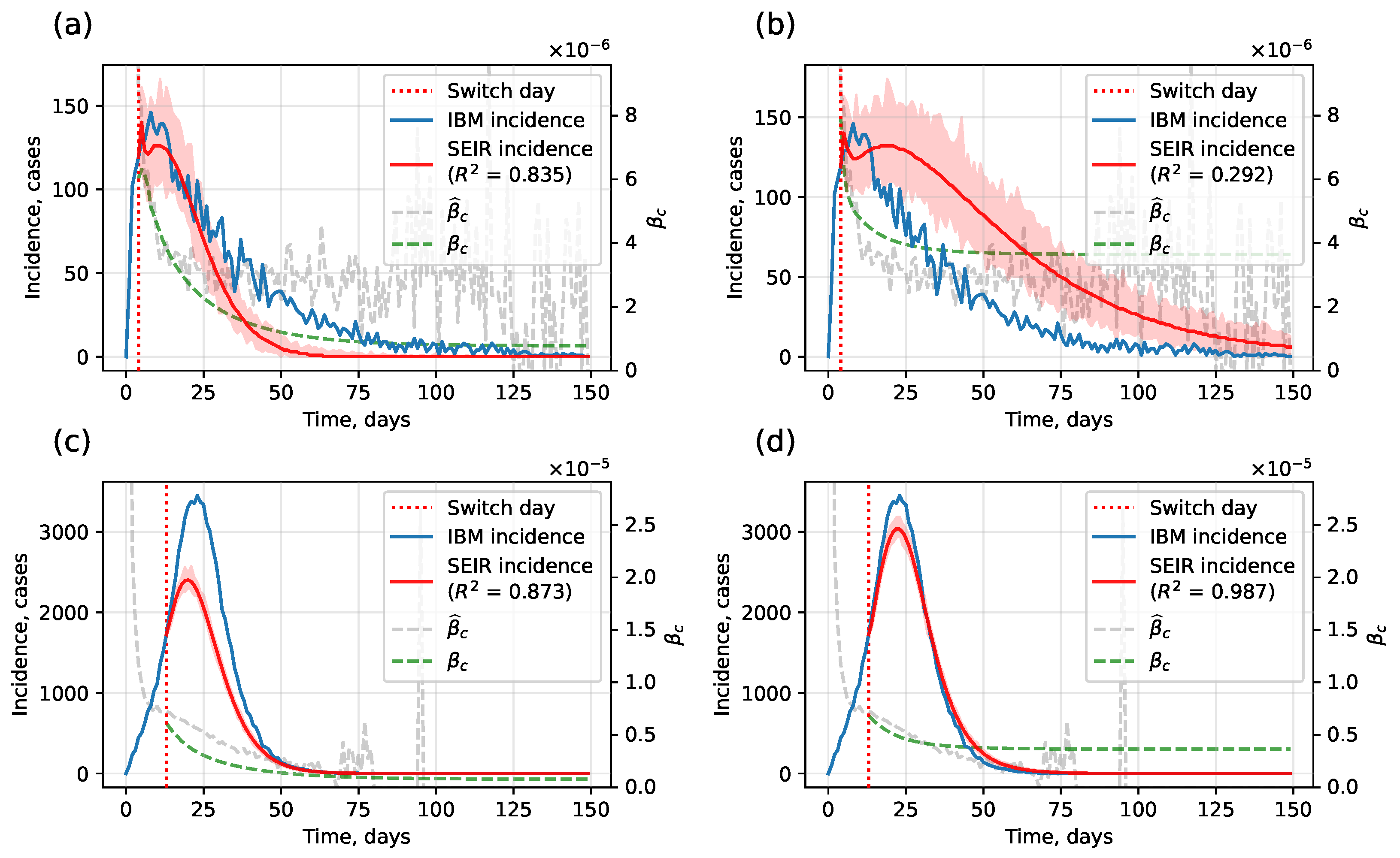 - Homogeneity assumption. When incidence remains very low, the SEIR submodel is ill-suited, and switching produces poor approximations.