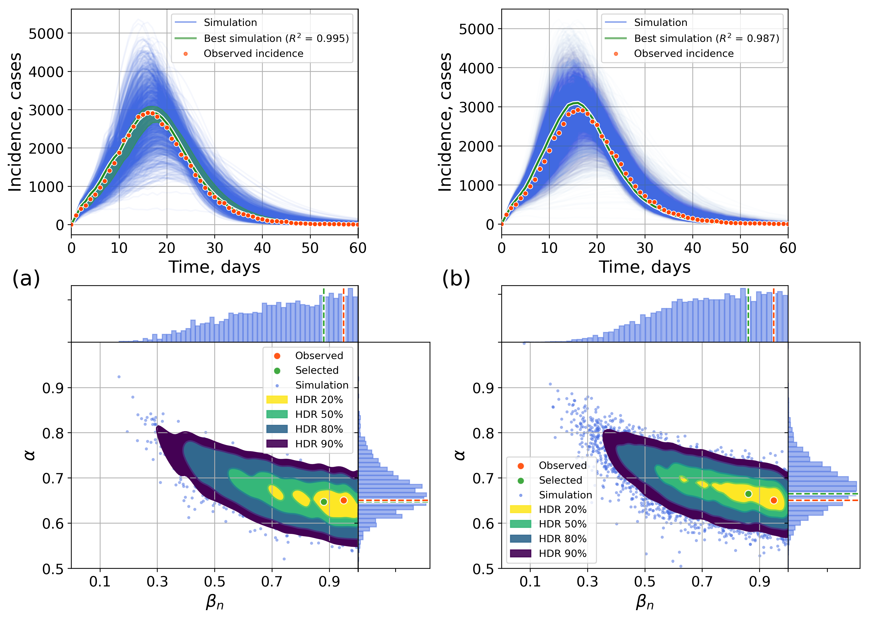 - Calibration with ABC-SMC requires the choice of . A smaller may narrow parameter range, but it requires more simulation time, which may limit our exploration under computational constraints.