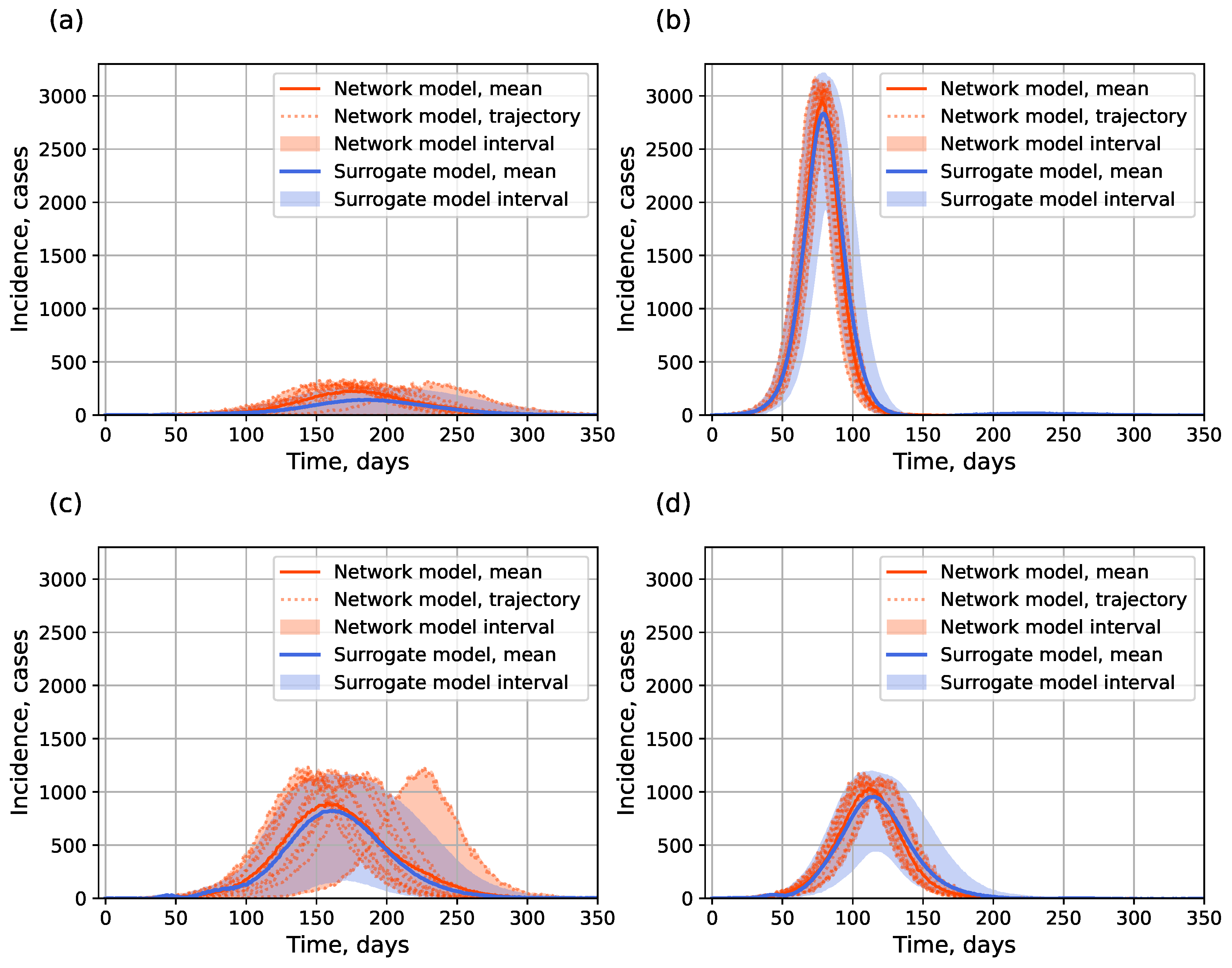 - Preservation of explicit stochasticity. Unlike the surrogate approach which produces a single deterministic output (point or interval assessment) for a fixed input parameter set, the hybrid approach is capable of generating multiple trajectories for a fixed input to reflect the influence of random factors, just like the original IBM it aims at replacing—by means of the actual IBM before the switch or via the stochastic SEIR model after the switch.