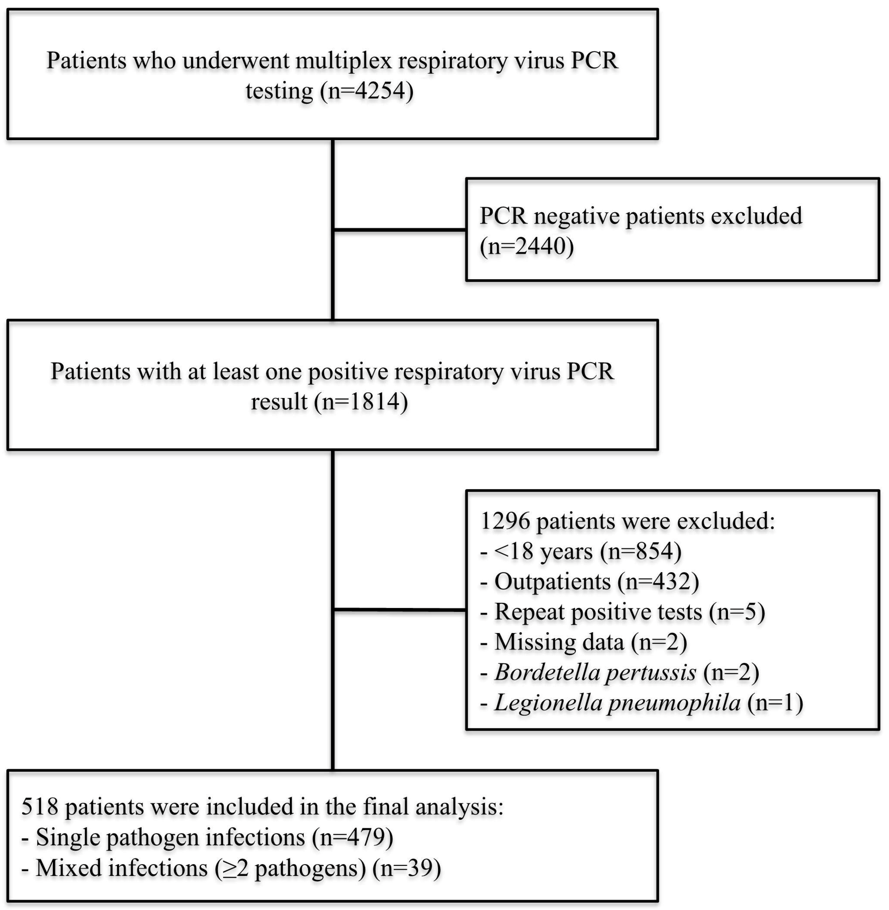During the study period, a total of 4254 patients underwent multiplex respiratory virus PCR testing. Of these, 2440 patients with negative test results were excluded. An additional 1296 patients were excluded due to age <18 years, outpatient status, missing data, or other exclusion criteria. The final analysis included 518 patients, comprising 479 (92.5%) cases with single pathogen infections and 39 (7.5%) cases with mixed infections (Figure 1).