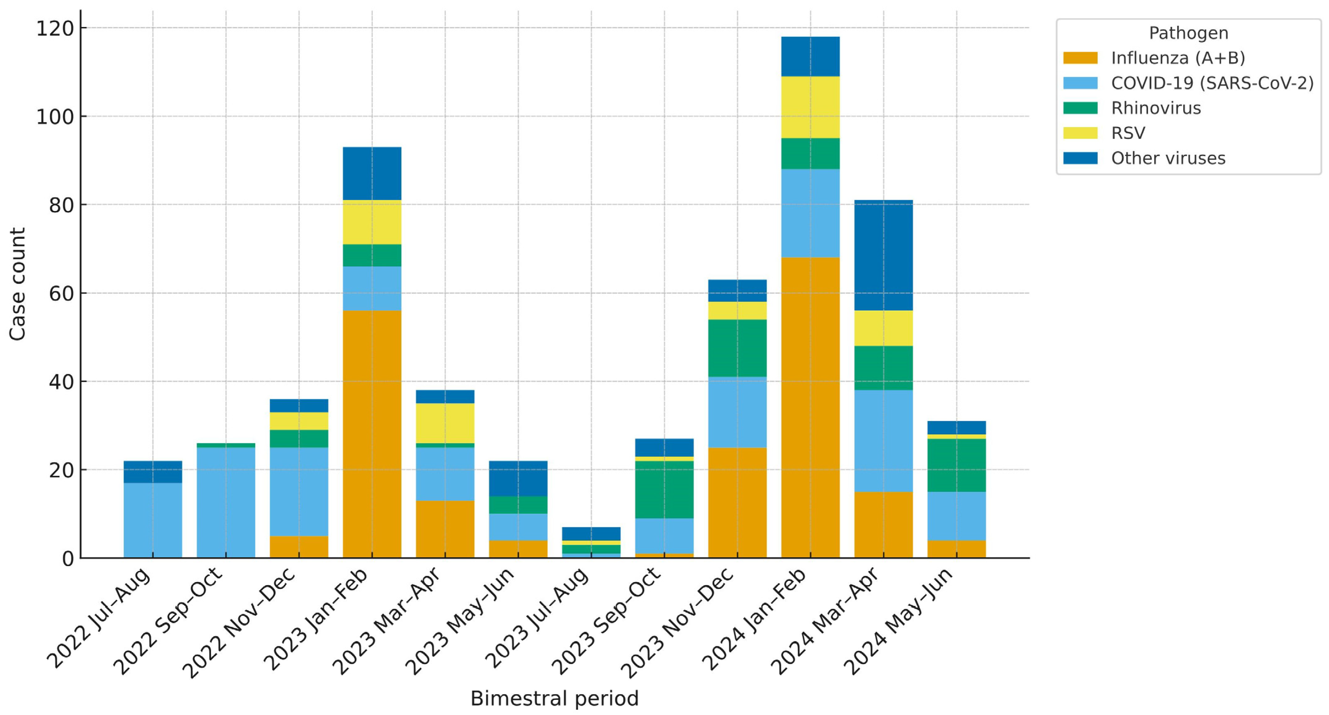 The leading detections were SARS-CoV-2 169 (32.6%) and Influenza A 167 (32.2%), followed by rhinovirus 72 (13.9%), RSV A/B 52 (10.0%), and Influenza B 24 (4.6%). Less frequent agents included parainfluenza viruses, human metapneumovirus, seasonal human coronaviruses (229E, OC43, HKU1, NL63), and adenovirus; mixed infections were identified in 39 patients (7.5%) (Table 2). The temporal distribution of detected viruses is illustrated in Figure 2. Influenza (A + B) and RSV displayed pronounced winter peaks during both study years, whereas SARS-CoV-2 showed similar seasonal surges but remained detectable throughout the year. Rhinovirus circulated year-round with intermittent fluctuations, and detections of other respiratory viruses occurred at low levels with irregular distribution.