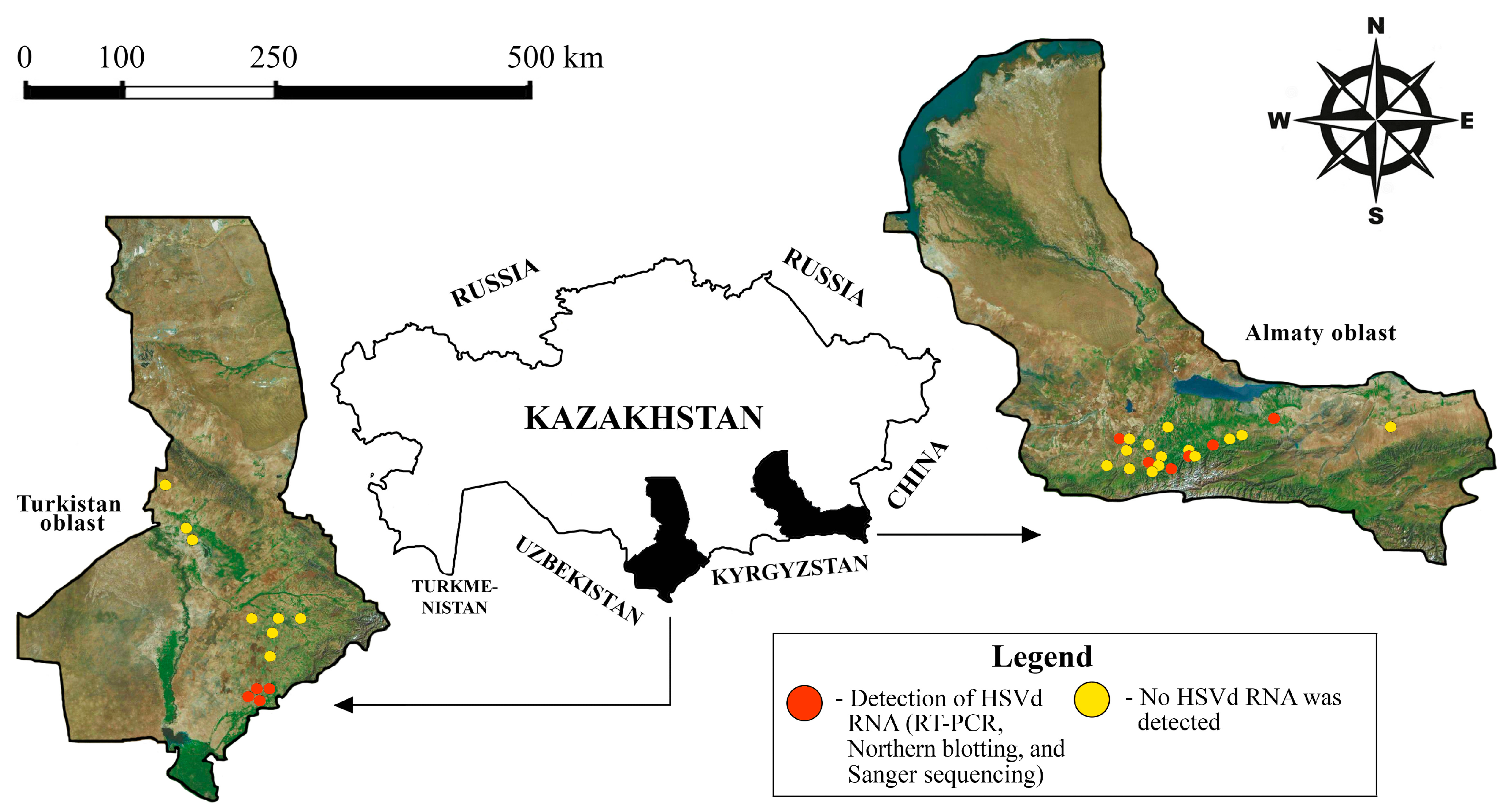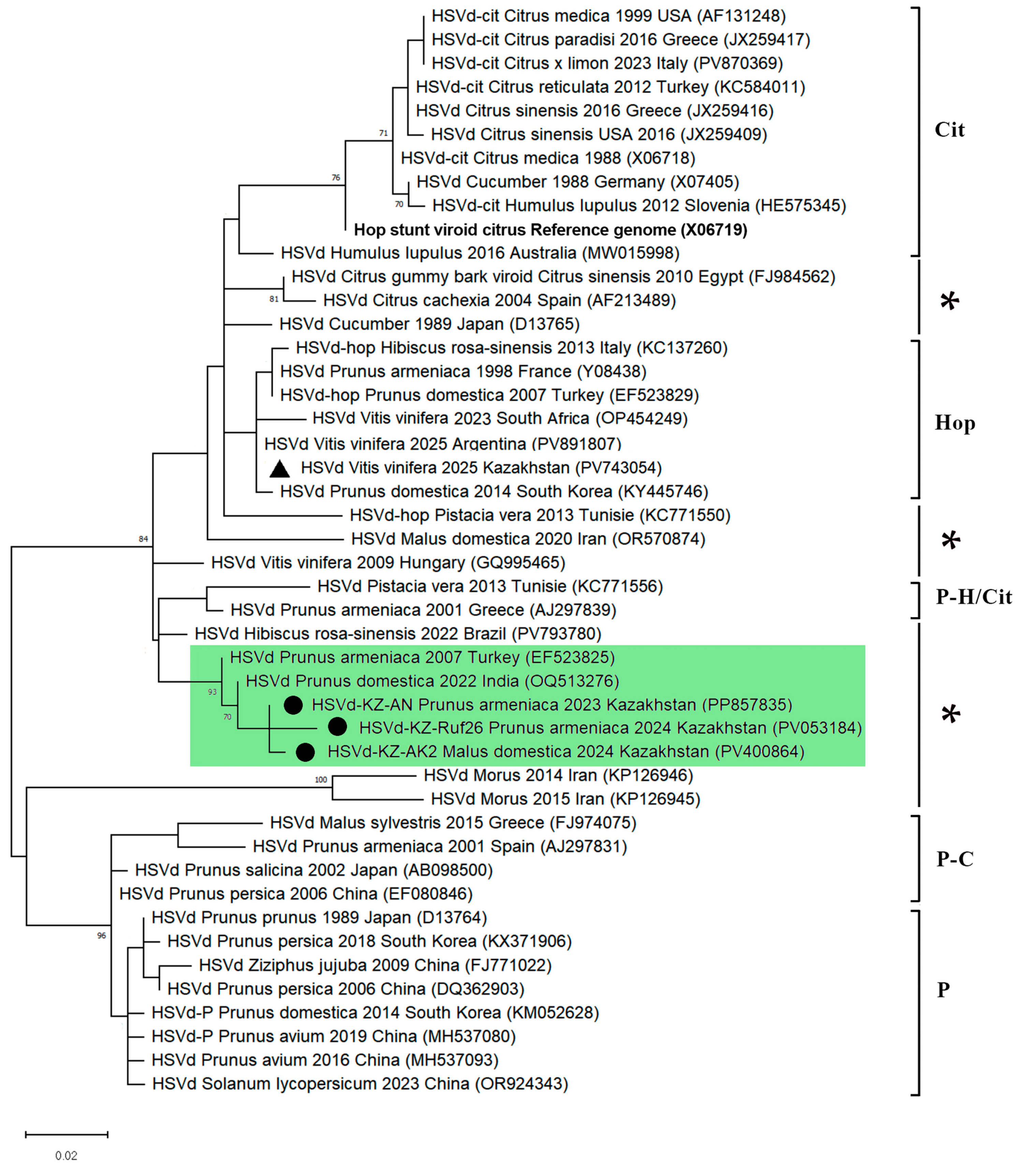 Nadirova, L.T.; Stanbekova, G.E.; Nizkorodova, A.S.; Kryldakov, R.V.; Iskakov, B.K.; Zhigailov, A.V. Molecular Survey and Genetic Characterization of Hop Stunt Viroid (HSVd) in Fruit Trees in Kazakhstan. Viruses 2025, 17, 1547. https://doi.org/10.3390/v17121547
