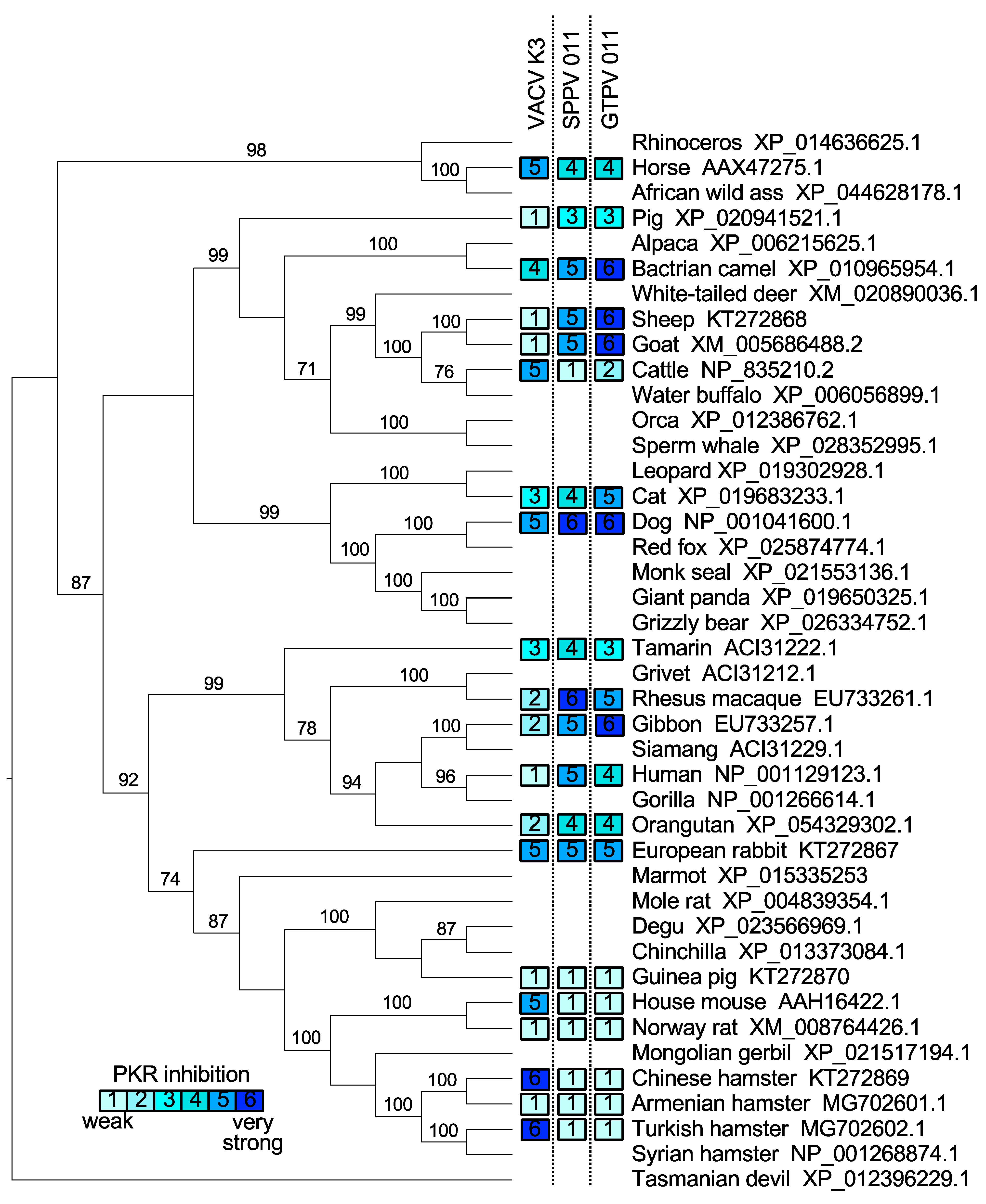 - Haller, S.L.; Park, C.; Bruneau, R.C.; Megawati, D.; Zhang, C.; Vipat, S.; Peng, C.; Senkevich, T.G.; Brennan, G.; Tazi, L.; et al. Host species-specific activity of the poxvirus PKR inhibitors E3 and K3 mediate host range function. J. Virol. 2024, 98, e0133124. [Google Scholar] [CrossRef]