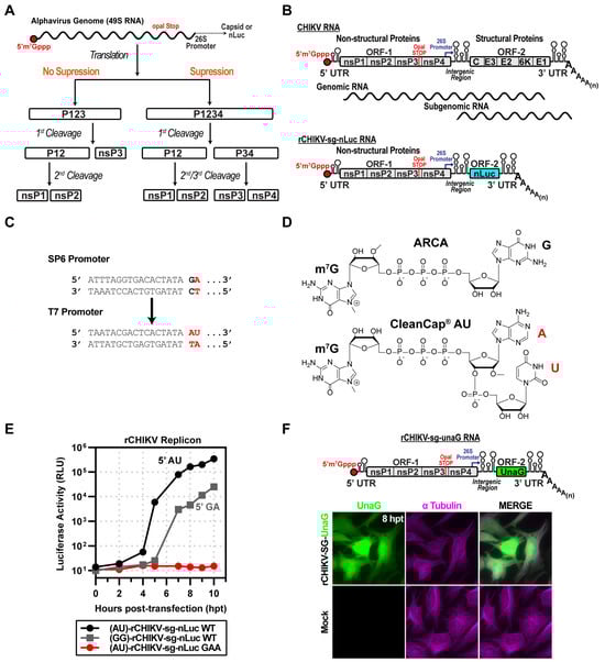 CHIKV replicon used in this study. (A) Schematic of proposed alphavirus polyprotein processing pathways. Following entry and uncoating, the genomic RNA (gRNA) undergoes cap-dependent translation through both suppression and non-suppression mechanisms. Without suppression, translation terminates at the leaky opal stop codon at the end of nsP3, producing the P123 polyprotein, which undergoes cis-cleavage, yielding P12 and nsP3. P12 is further processed into nsP1 and nsP2. In the suppression pathway, opal read-through produces P1234, which is cleaved in stages to yield P12 and P34, and subsequently cleaved into nsP1/nsP2 and nsP3/nsP4. (B) Organization of the CHIKV genome and replicon (rCHIKV-sg-nLuc). The positive-strand RNA genome is capped at the 5′ end and polyadenylated at the 3′ end. ORF-1 encodes nsP1–4, followed by a 26S subgenomic promoter and ORF-2 encoding structural proteins (C, E3, E2, 6K, E1). The replicon replaces structural proteins with nanoluciferase (nLuc), expressed from the subgenomic RNA. (C) Promoter and cap analog comparison: SP6 promoter with ARCA (GA) vs. T7 promoter optimized for CleanCap (AU). (D) Chemical structures of ARCA and CleanCap AU used in in vitro transcription of replicons. (E) Comparison of capped rCHIKV-sg-nLuc RNAs. AU-capped RNAs yielded stronger luciferase signals relative to GA-capped transcripts. The GAA mutant of nsP4 (polymerase-inactive) produced only a background signal. (F) Fluorescent reporter version (rCHIKV-sg-UnaG), UnaG placed in ORF-2. Transfected HeLa cells displayed UnaG fluorescence (green), with tubulin immunostaining (magenta) marking cell boundaries. Mock controls lacked UnaG signal.