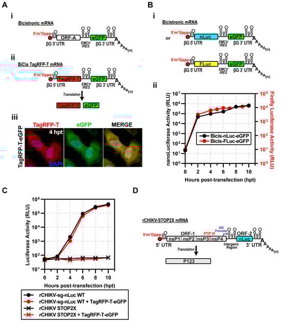 Strategy to express CHIKV proteins to complement replicating subgenomic RNA replicons in trans. (A) (i) Design of a bicistronic (BiCis) mRNA containing a β-globin 5′UTR, ORF-A, EMCV IRES, eGFP, β-globin 3′UTR, and poly(A). (ii) BiCis-TagRFP-T produces TagRFP-T (cap-dependent) and eGFP (IRES-dependent). (iii) Representative fluorescence images at 4 h post-transfection in HeLa cells. TagRFP-T (red) and eGFP (green) display a robust signal. (B) (i) BiCis nLuc and Fluc constructs, either reporter placed in ORF-A. (ii) Reporter translation confirmed by luciferase assays in electroporated HeLa lysates. (C) Replicon competition assays: nLuc activity of rCHIKV-sg-nLuc WT or STOP2X ± BiCis TagRFP-T/eGFP. WT replicons produced robust nLuc activity regardless of co-expression; STOP2X yielded no signal. (D) Schematic of rCHIKV STOP2X, with two stop codons replacing the opal site, preventing nsP4 expression. STOP2X: nsP4 translation terminated by two stop codons replacing the opal codon at the end of the nsP3-coding region, producing P123 only.