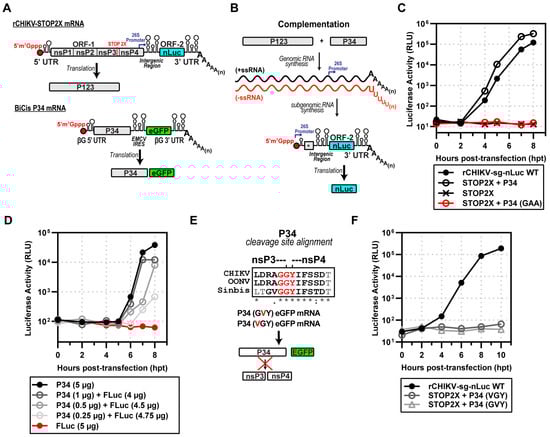We were now able to repeat the experiment performed by Lemm and Rice with SINV [] using CHIKV. We co-transfected rCHIKV-STOP2X and BiCis-P34 mRNAs to produce P123 and P34 precursor proteins (Figure 3A). These proteins supported minus-strand synthesis followed by genomic and subgenomic RNA synthesis (Figure 3B). The subgenomic RNA encodes nLuc, so we indirectly monitored subgenomic RNA synthesis by measuring luciferase activity (Figure 3B). Transfection of STOP2X mRNA alone yielded no luciferase signal (STOP2X in Figure 3C). In combination with P34 mRNA, however, luciferase activity was observed beginning at 2 h post-transfection (STOP2X + P34 WT in Figure 3C). The observed kinetics were on par with the kinetics observed for the complete CHIKV replicon (rCHIKV-sg-nLuc WT in Figure 3C). Production of luciferase activity required the nsP4 domain of P34 to be an active RdRp, as mutation of the signature GDD motif to GAA precluded production of luciferase activity (STOP2X + P34 GAA in Figure 3C). We observed a dependency on the amount of P34 mRNA delivered with the STOP2X for complementation as assessed by luciferase activity (Figure 3D). Inactivating nsP2-dependent proteolysis of P34 (Figure 3E) eliminated complementation (Figure 3F).