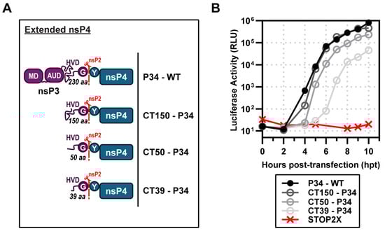 Identification of a minimal P34 precursor for subgenomic RNA synthesis. (A) Schematic of extended nsP4 constructs lacking domains of nsP3—macro domain (MD), alphavirus unique domain (AUD), and partial hyper-variable domain (HVD)—which produce CT150, CT50, or CT39-P34. (B) Complementation assays: STOP2X supported subgenomic RNA synthesis with P34 WT, CT150, and CT50, and partially with CT39-P34.