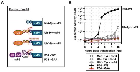 The discovery that Ub-nsP4 could substitute for P34 in plasmid/vaccinia-based trans-replication systems led many groups to deprioritize P34 as the relevant precursor in subsequent studies. In recent years, there has been minimal mention of P34, even in the description of the P1234 precursor processing pathway, since the ability of Ub-nsP4 to substitute for P34 was revealed []. P34 has been observed in other alphaviruses but has not been studied extensively [,,]. Indeed, most studies evaluating the ability of an RdRp from one alphavirus species to substitute for that from another have used nsP4 as the Ub-nsP4 fusion [,,].