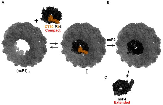 Proposed model for an nsP4 precursor role in CHIKV RNA synthesis. (A) P34 and functional derivatives (CT50-P34) bind to the central channel of an nsP1 dodecamer. The CT50 portion of P34 is highlighted in orange, and P4 in black. (B) nsP2 cleaves the (nsP1)12-bound P34, activating its RdRp activity. Physical interactions between nsP4 and (nsP1)12 maintain nsP4 in its active compact conformation. (C) Once RNA synthesis is complete, dissociation of nsP4 from (nsP1)12 causes a fold switch to the extended, inactive extended conformation. Model built using ONNV CT50-P34 Alphafold/SAXS-derived structure (bioRxiv:2025.09.18.676892 []) and nsP1 structure (PDB: 7Y38).