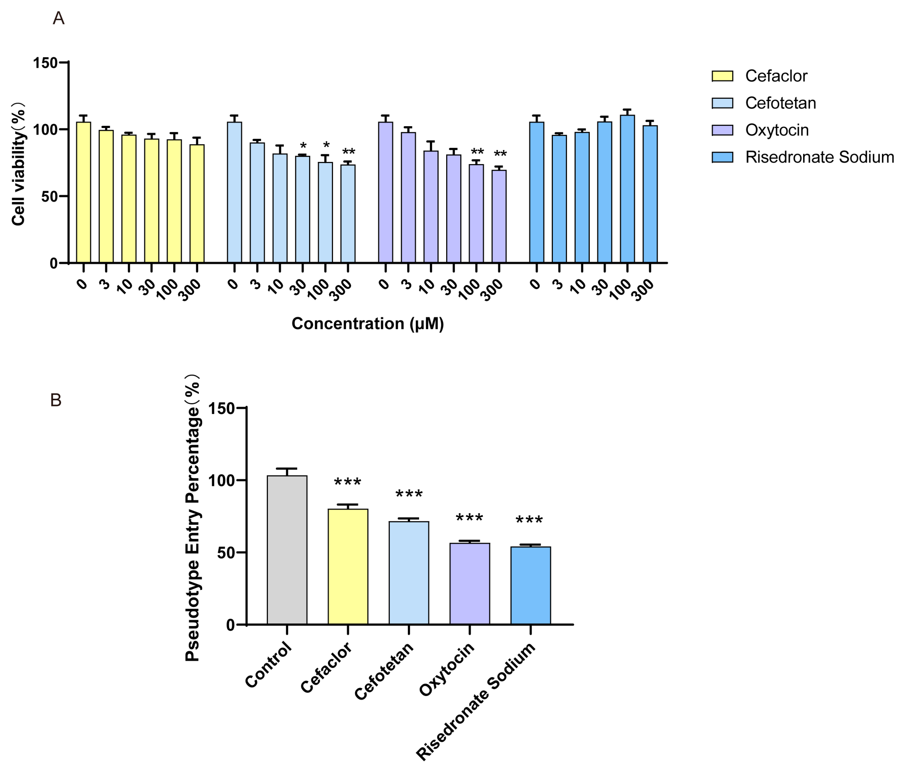 3.5. The Inhibition Effect of Molecules on SARS-CoV-2 Spike Pseudotyped Virus