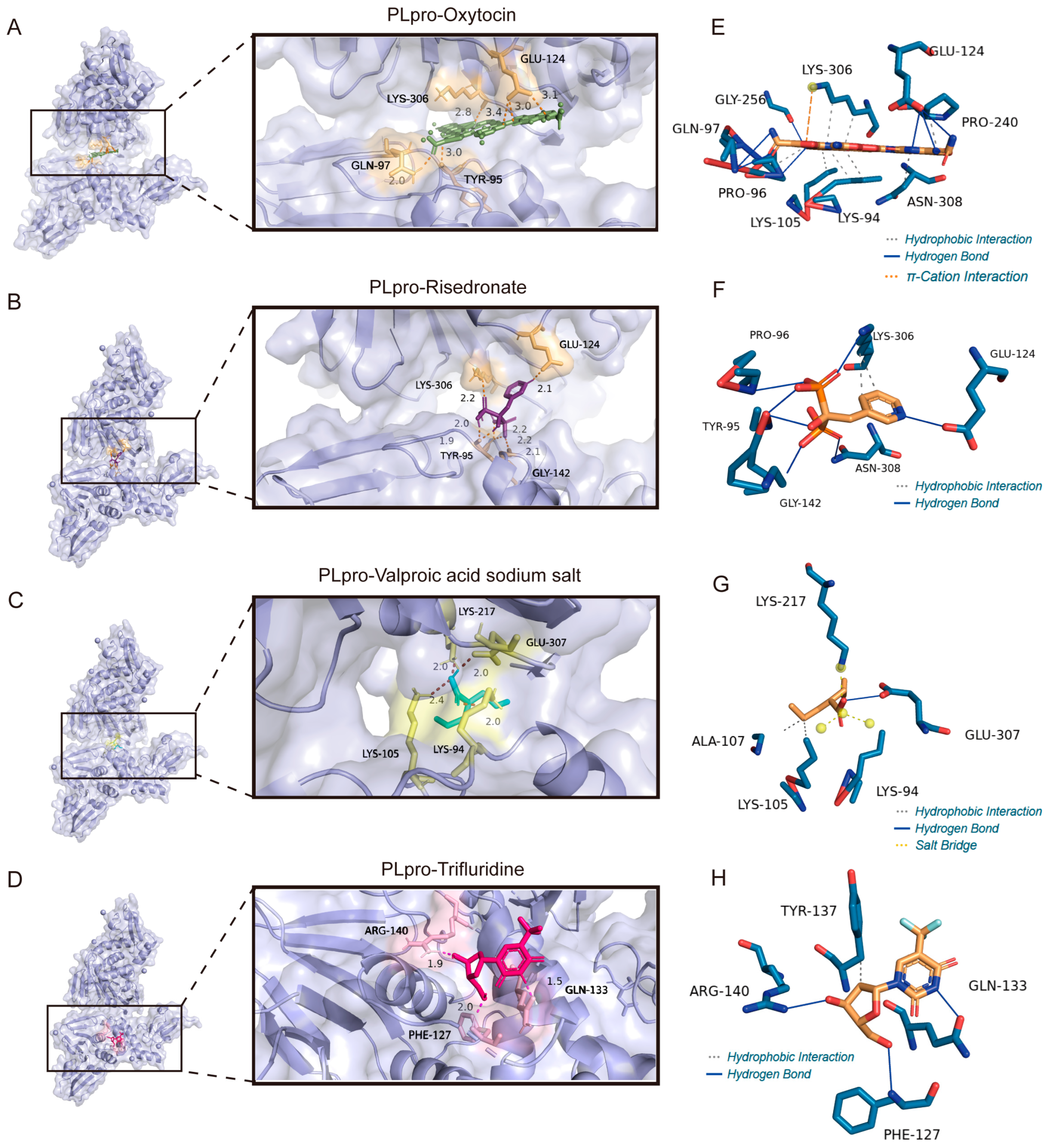 3.7. The Binding Model Simulation of Active Compounds with PLpro