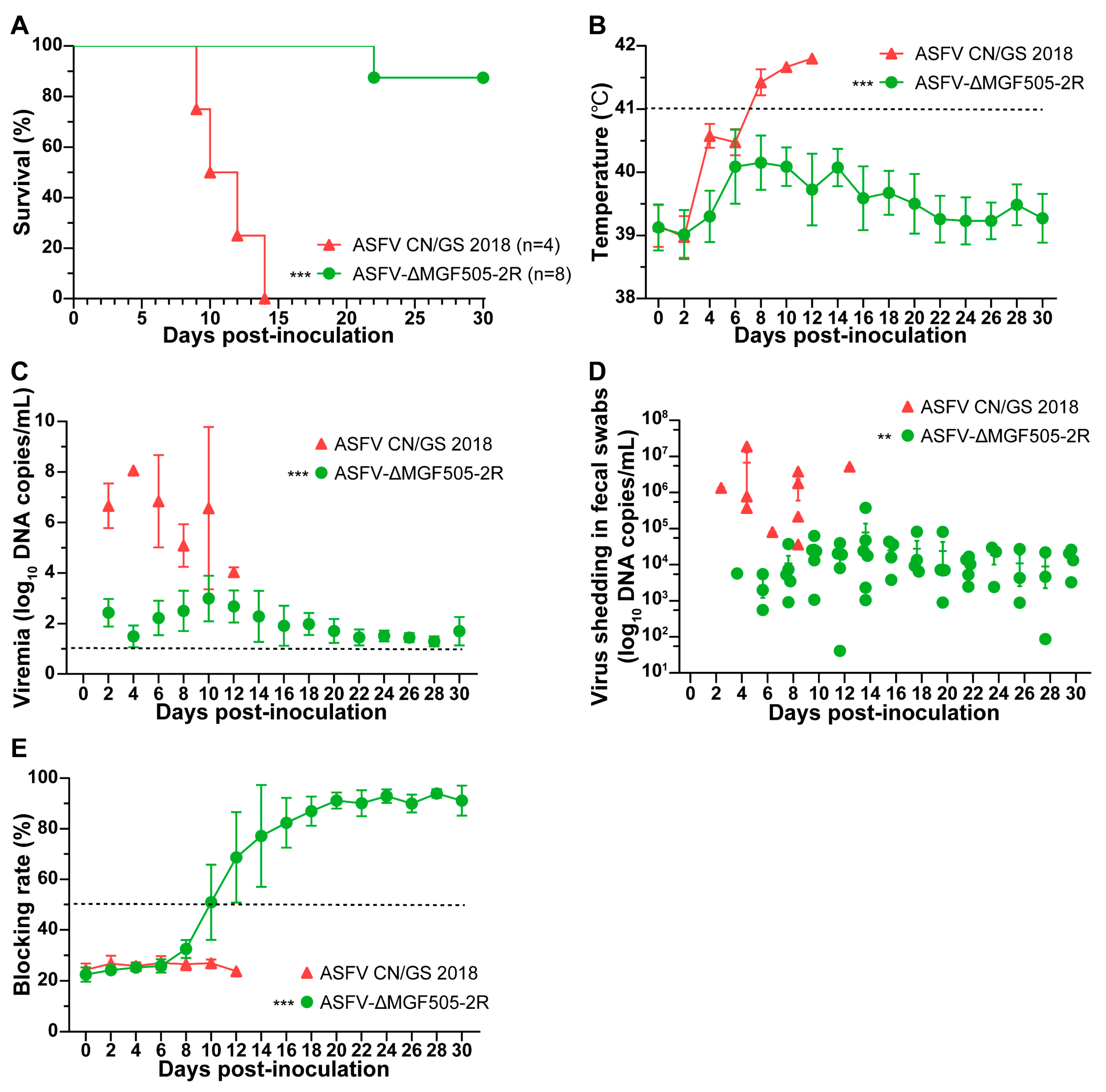 4.2. ASFV-ΔMGF505-2R Was Largely Attenuated in Piglets