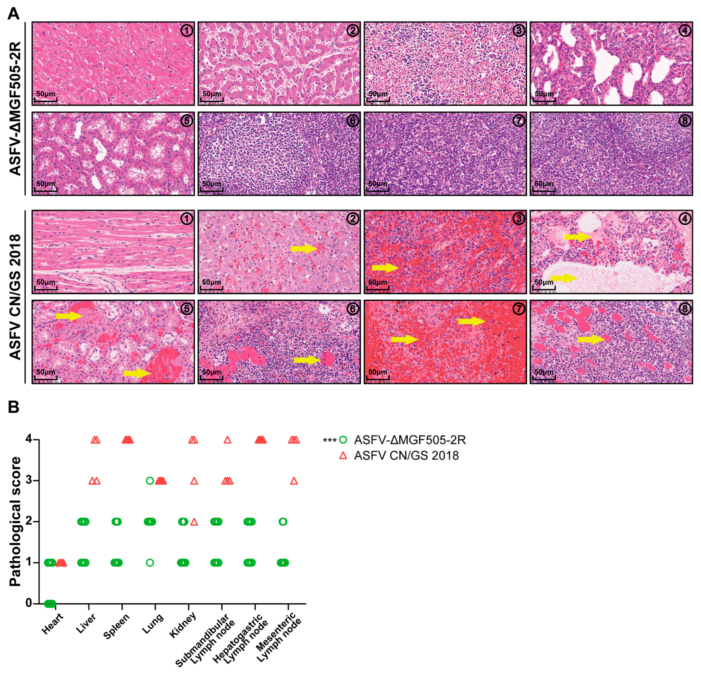 3.3. ASFV-ΔMGF505-2R Group Showed Only Mild to Moderate Histological Changes