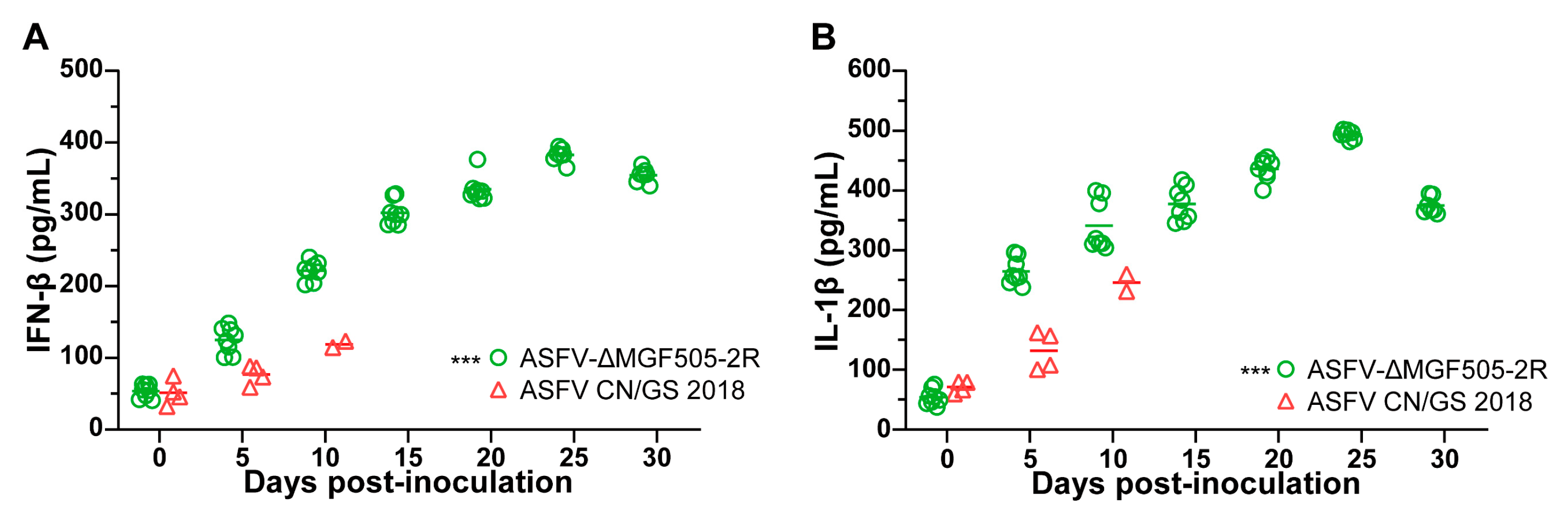- Li, J.; Song, J.; Kang, L.; Huang, L.; Zhou, S.; Hu, L.; Zheng, J.; Li, C.; Zhang, X.; He, X.; et al. pMGF505-7R determines pathogenicity of African swine fever virus infection by inhibiting IL-1β and type I IFN production. PLoS Pathog. 2021, 17, e1009733. [Google Scholar] [CrossRef]