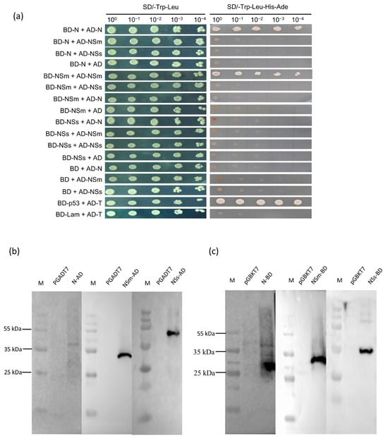 The expression of the fusion proteins in Y2HGold yeast was verified by Western blot to support the Y2H interaction data. Total protein extracts were analyzed by SDS-PAGE followed by immunoblotting with anti-c-Myc (for BD fusions) and anti-HA (for AD fusions) antibodies. As shown in Figure 1b,c, the bands corresponding to the predicted sizes were detected for BD-N, BD-NSm, BD-NSs, AD-N, AD-NSm and AD-NSs. This confirms the successful expression of all six fusion proteins and is consistent with the observed Y2H interaction results.