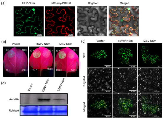 To further check whether the NSm protein functions as a movement protein mediating viral cell-to-cell movement via PD, we co-infiltrated N. benthamiana leaves with Agrobacterium cultures expressing NSm together with ΔCMV-GFP. As shown in Figure 4b,c, similar to the positive control TSWV NSm, the TZSV NSm protein was observed to mediated the cell-to-cell movement of the movement-deficient CMV mutant via the PD. At 6 dpi, a total of 45 of the 50 fluorescent signals were detected in the leaves co-expressing TZSV NSm and ΔCMV-GFP (Table 1). However, in the leaves co-expressing ΔCMV-GFP and either TZSV NSm or TSWV NSm, the GFP signal was observed to have spread into adjacent cells, indicating successful cell-to-cell movement. In contrast, the fluorescence signal in the control sample remained confined within the initially infiltrated cells (Figure 4c).