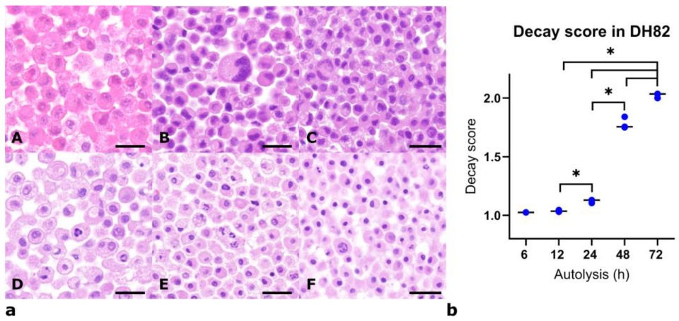 3.1. Histomorphological Assessment of DH82 Cells Under Different Fixation and Autolysis Conditions
