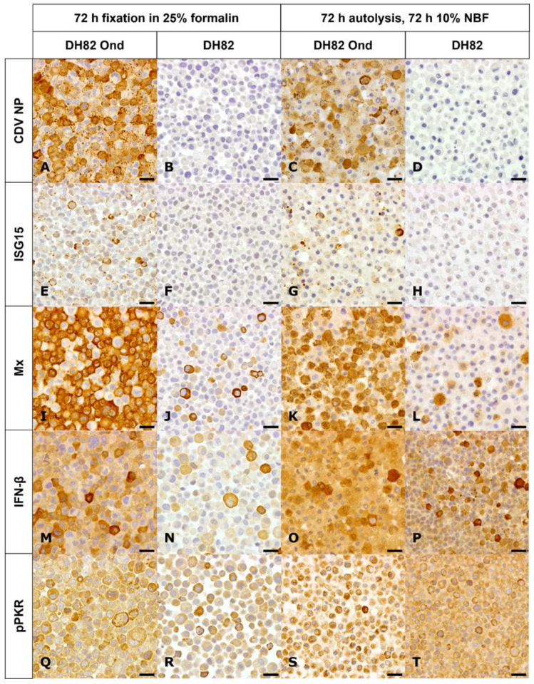 Gerhards, H.; Rohn, K.; Puff, C.; Baumgärtner, W. An In Vitro Approach to Evaluate the Impact of Autolysis and Formalin Fixation on the Detection of Canine Distemper Virus and Innate Immune Response Antigens. Viruses 2025, 17, 1575. https://doi.org/10.3390/v17121575