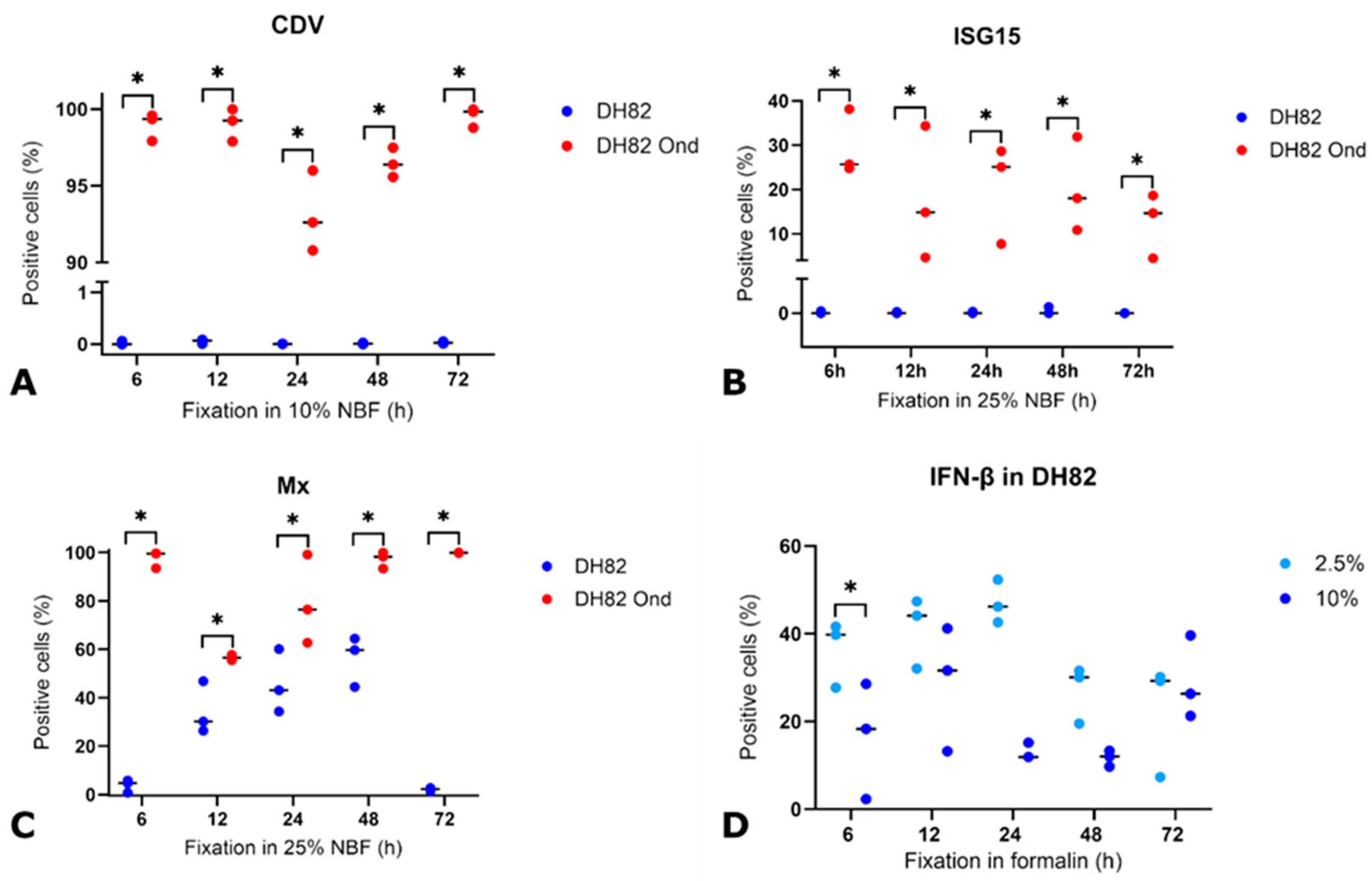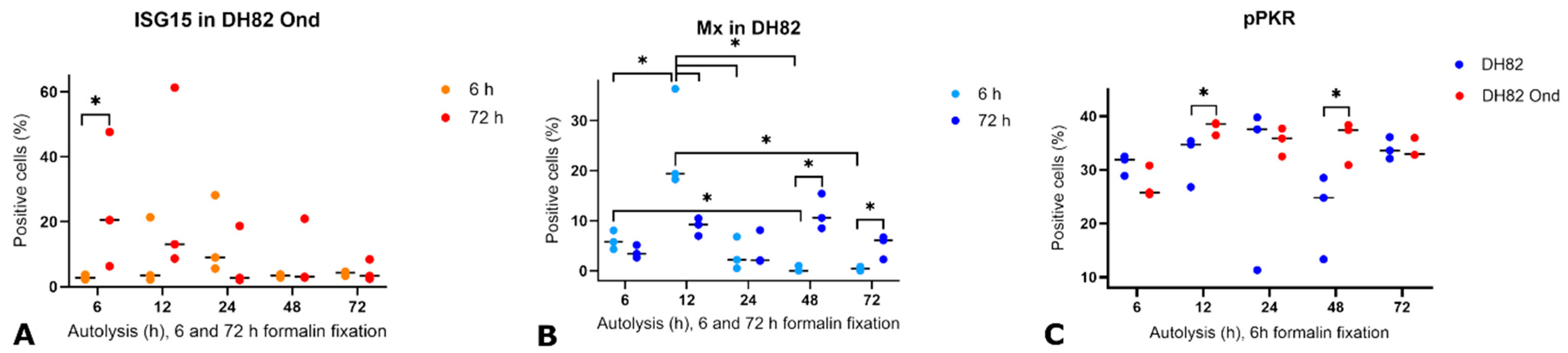 3.3. Detection and Expression of ISG15, Mx, IFN-β, Phosphorylated PKR (pPKR), and Its Stability Under Various Pre-Fixation Conditions