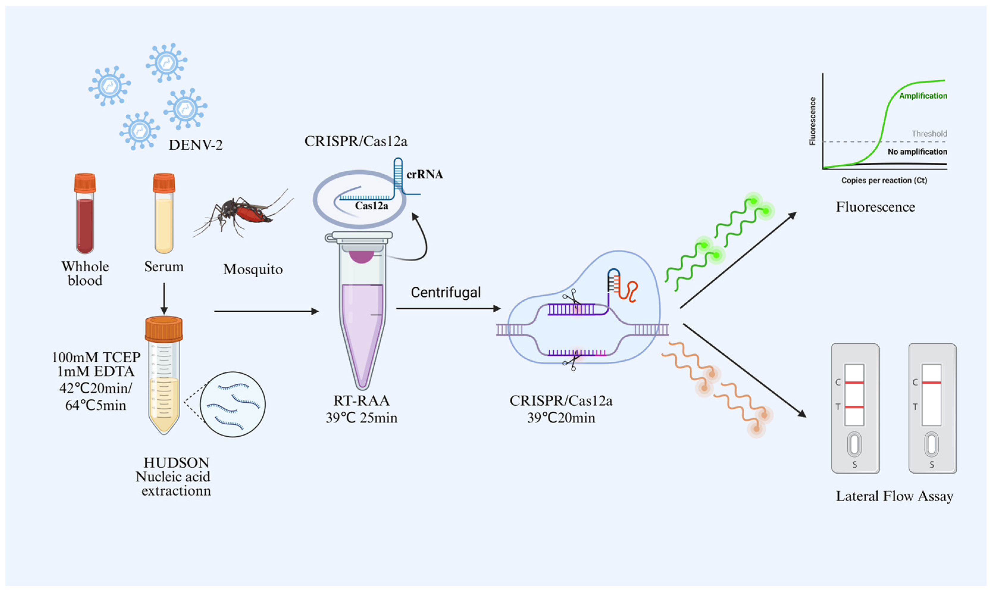 Tan C, Xing S, Xie X, Chen X, Liu X, Wang W, Liu L, Zhou X, Wu J, Li C. Development and Application of a Rapid Field Detection Technology for DENV-2 Based on the HUDSON Nucleic Acid Extraction-Free/RT-RAA/CRISPR-Cas12a System. Viruses. 2025; 17(12):1579. https://doi.org/10.3390/v17121579