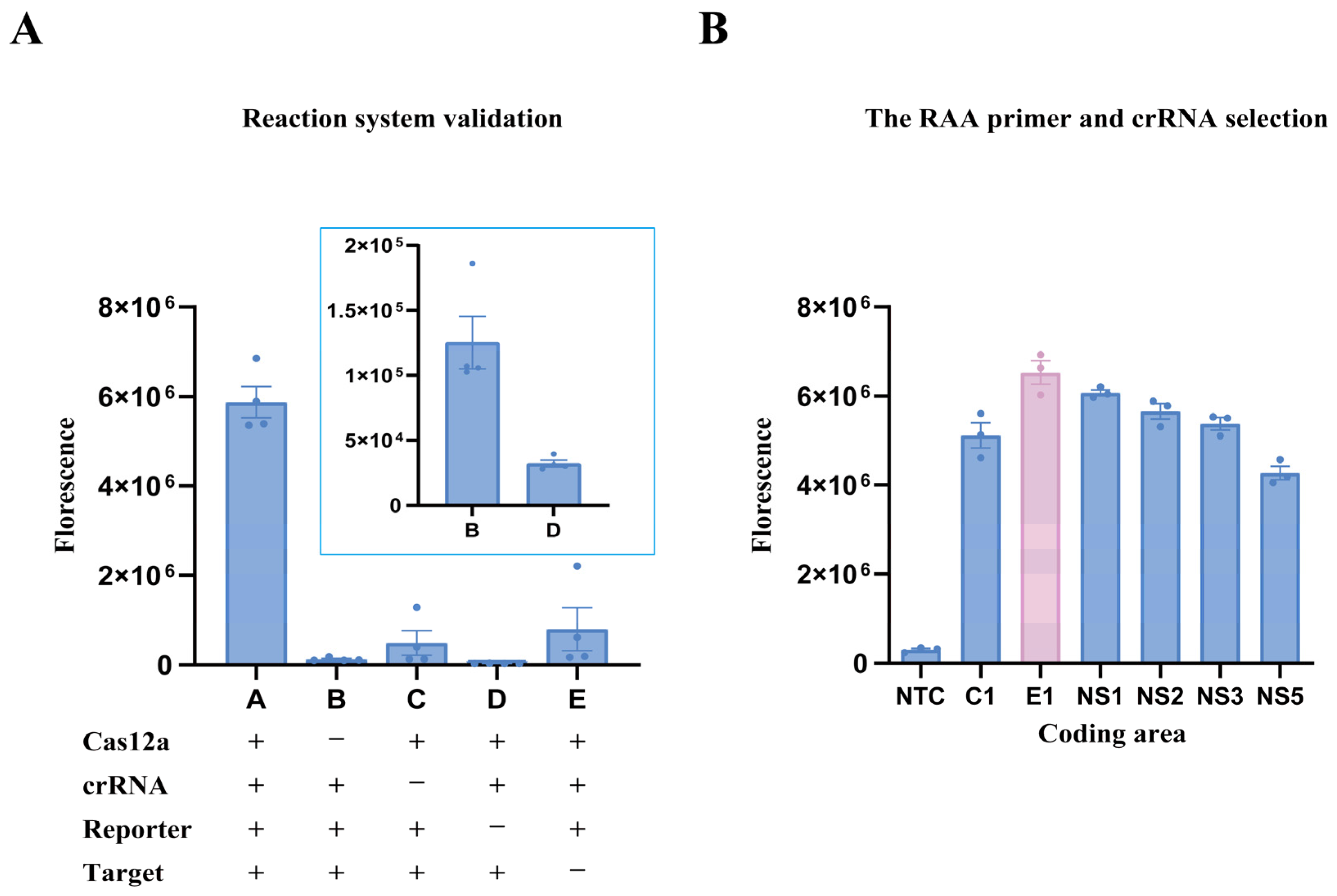 3.3. Validation of the RT-RAA-Cas12a Fluorescence Reaction System and Selection of RT-RAA Primers and crRNA