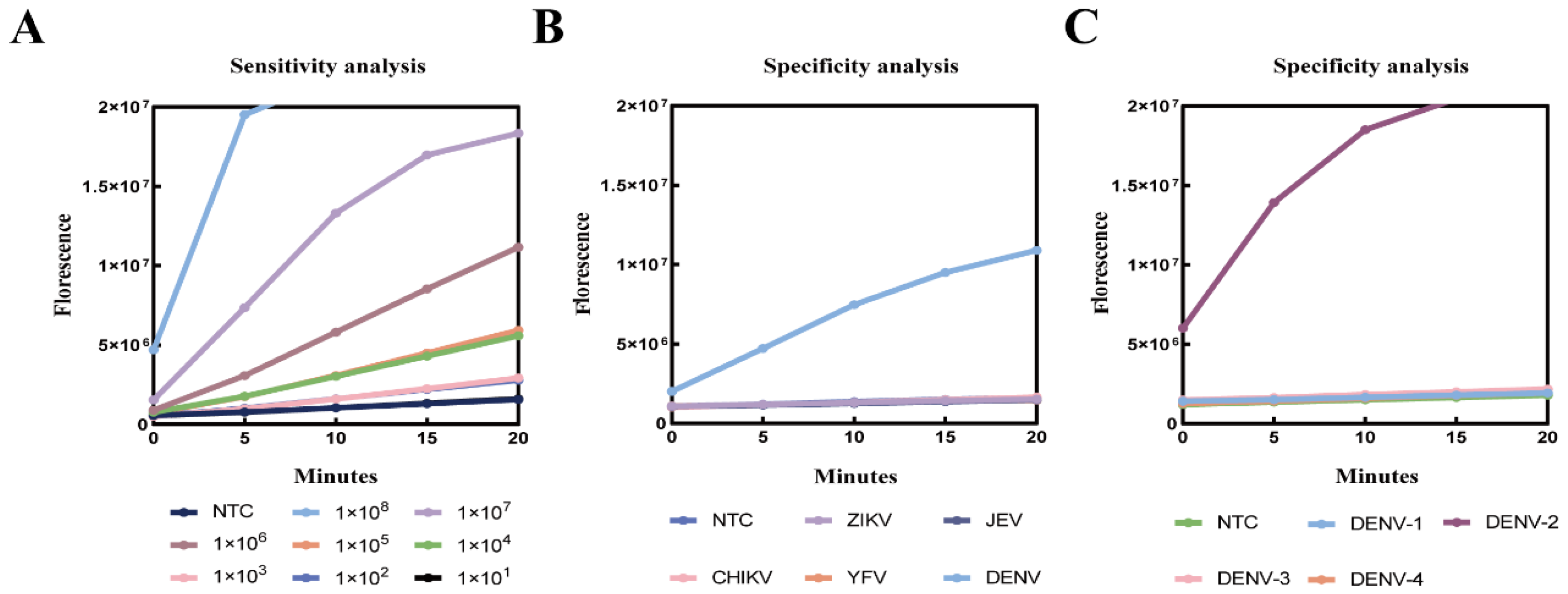 2.4. Design of DENV-2-Specific RT-RAA Amplification Detection Primers and Cas12a crRNA