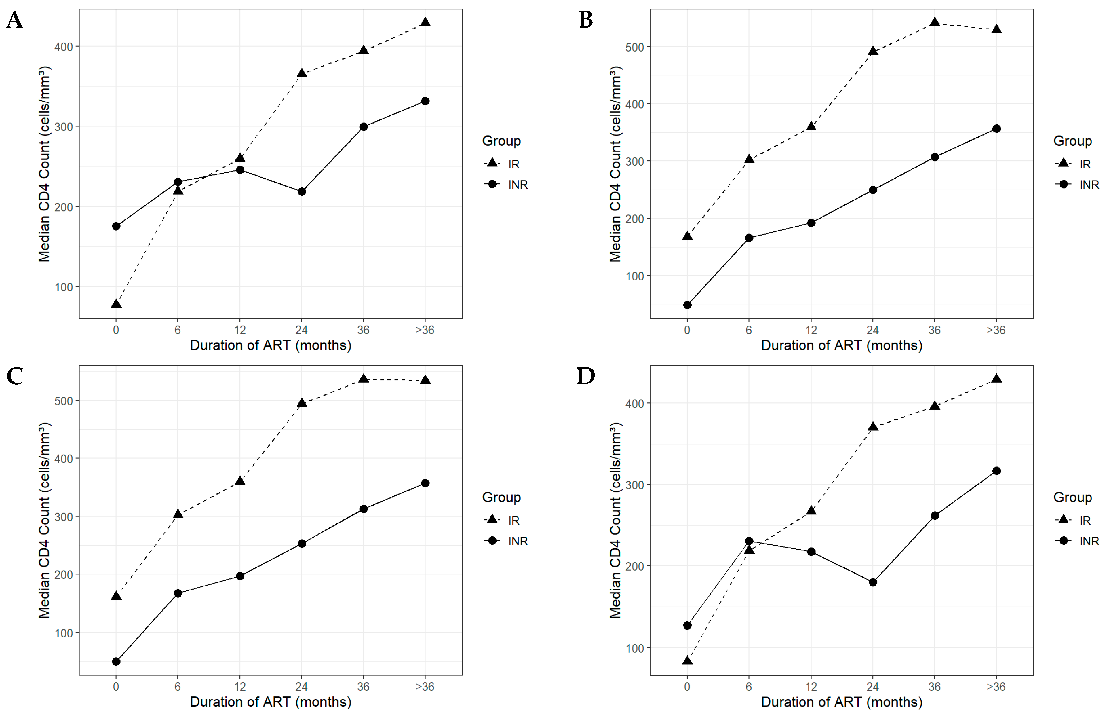 - Zhao, H.; Feng, A.; Luo, D.; Yuan, T.; Lin, Y.F.; Ling, X.; Zhong, H.; Li, J.; Li, L.; Zou, H. Factors Associated with Immunological Non-Response after ART Initiation: A Retrospective Observational Cohort Study. BMC Infect. Dis. 2024, 24, 138. [Google Scholar] [CrossRef] [PubMed]