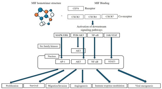 The MIF signaling pathway begins with MIF binding to its primary receptor, CD74, on the plasma membrane. In many cases, it also involves chemokine receptors like CXCR2, CXCR4, and CXCR7 [3]. These receptors and co-receptors activate several key intracellular pathways, including MAPK/ERK, PI3K/AKT, NF-κB, and JAK/STAT pathways, which regulate essential cellular processes such as proliferation, migration, survival, angiogenesis, and apoptosis resistance [3,4,5,6] (Figure 1). MIF can also be internalized by cells via endocytosis, where it interacts with cellular factors like Jun Activation Domain-binding Protein 1 (JAB1) and COP9 signalosome subunit 5 (CSN5), influencing various cellular activities, including gene regulation, metabolism, immune responses, and tumor progression [3].