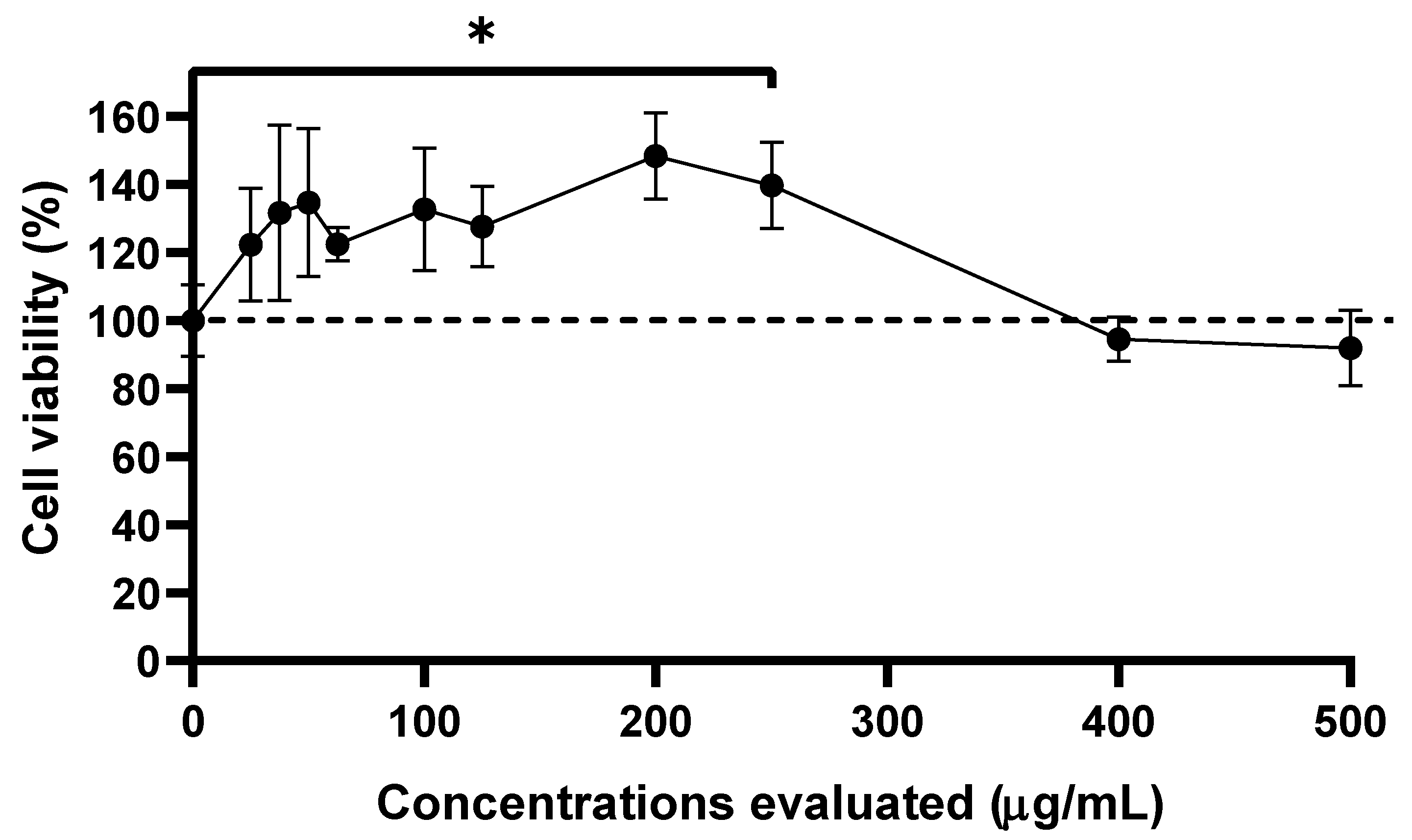 | Concentration (µg/mL) | Cell Viability (%) ± SEM | ||