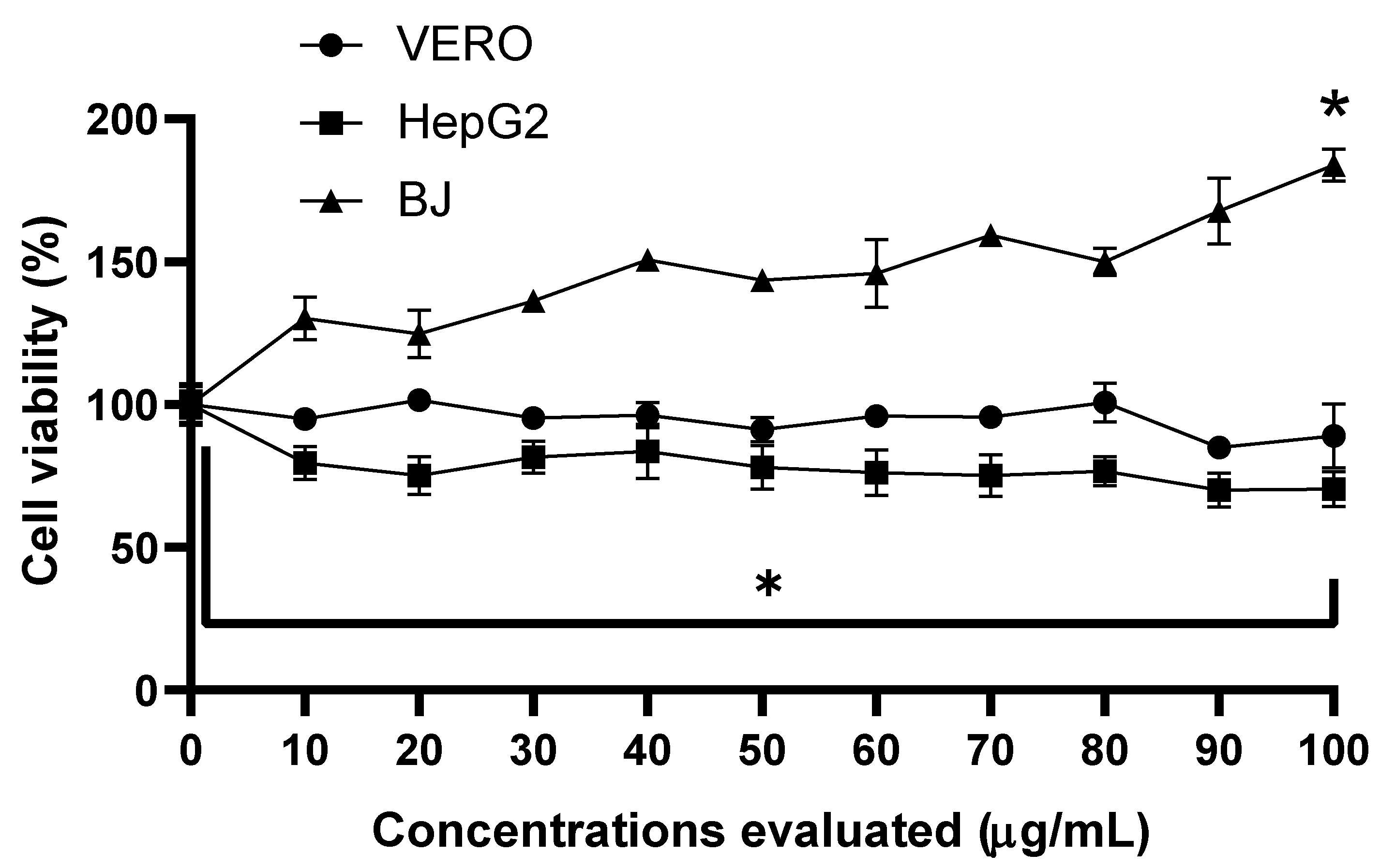 2.6. Evaluation of the Cytotoxic Activity of Spirulina maxima (Arthospira) Extracts