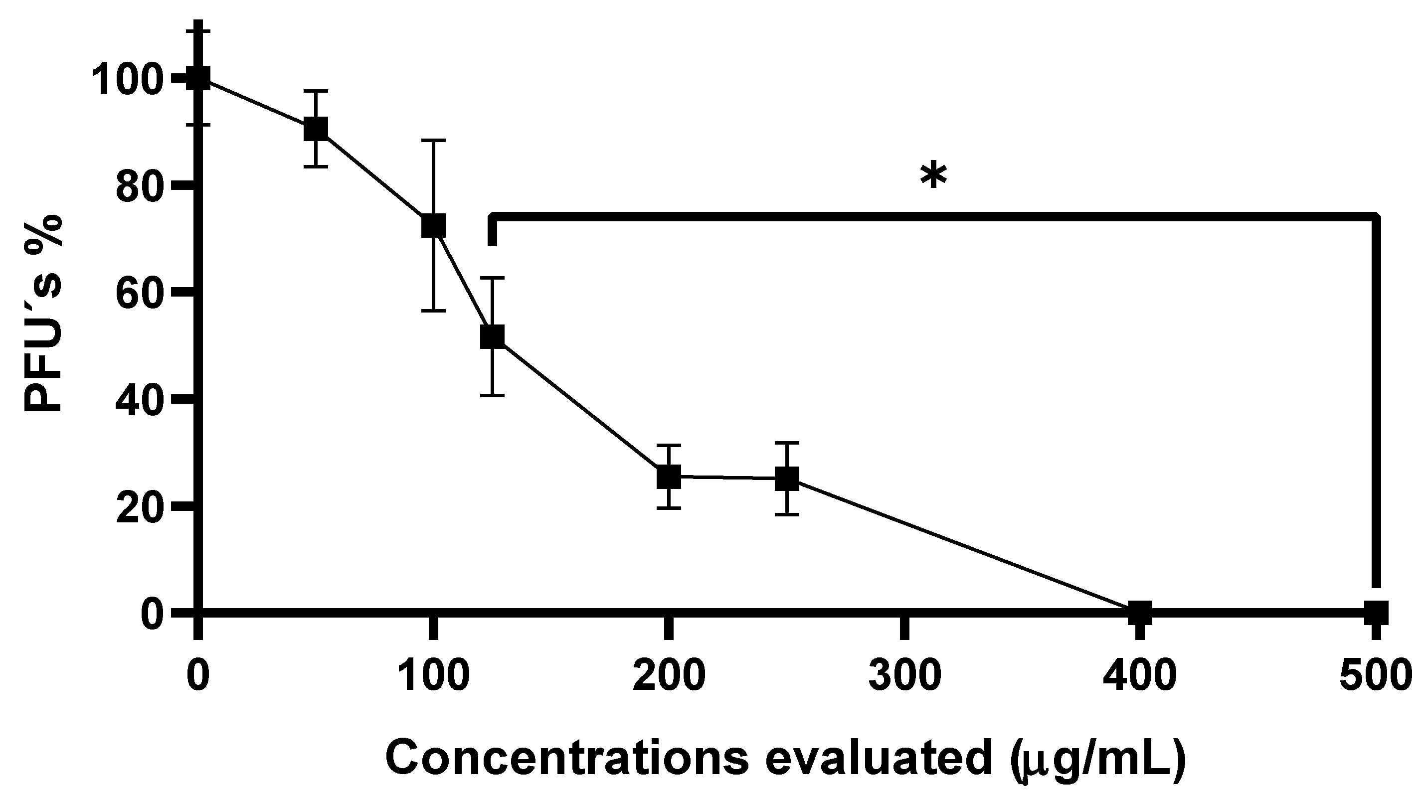 | Concentration (µg/mL) | % PFU’s ± SEM | ||